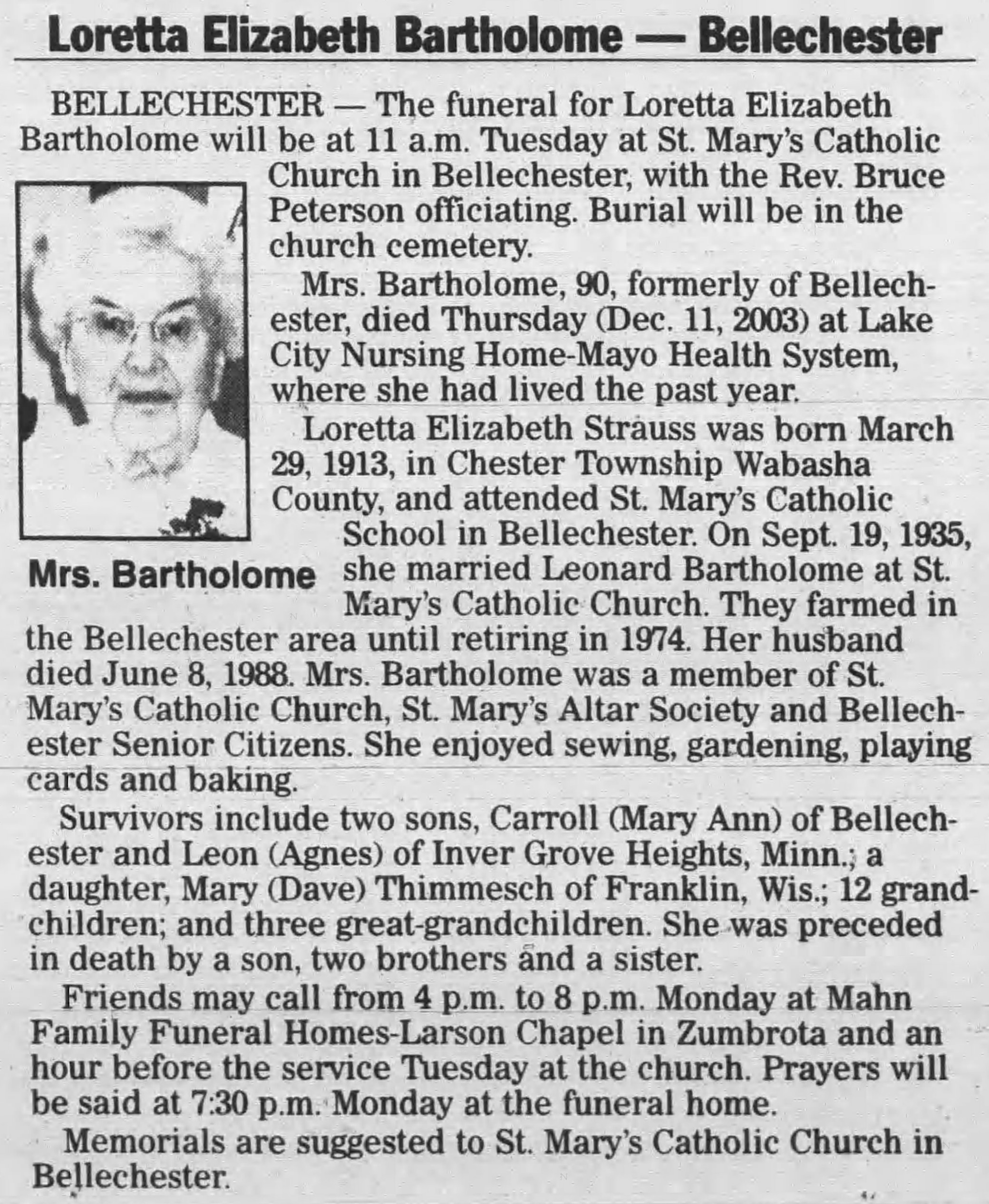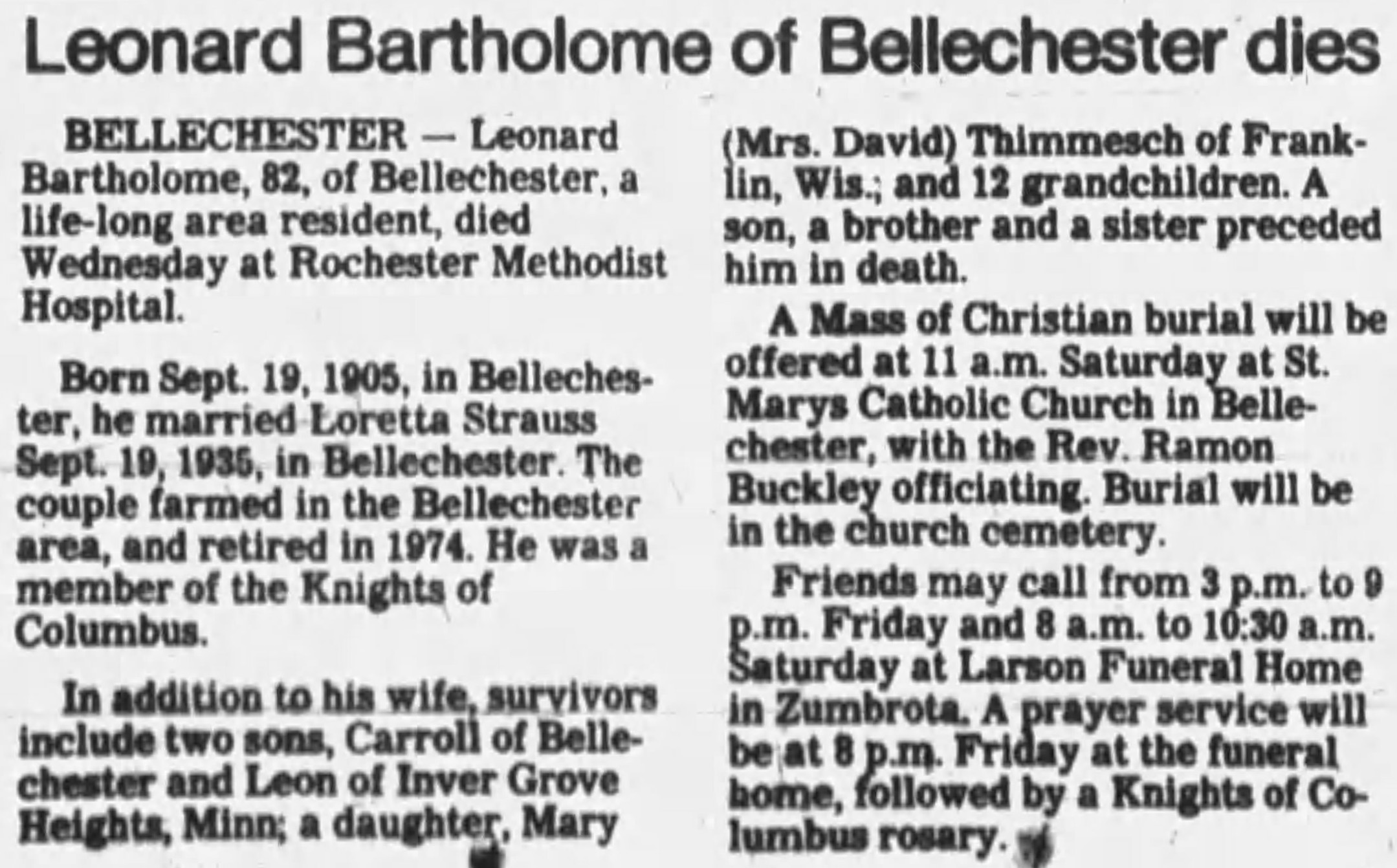 Loretta married Leonard Nicholas Bartholome on September 19, 1935 in Bellechester, Goodhue Co, MN.