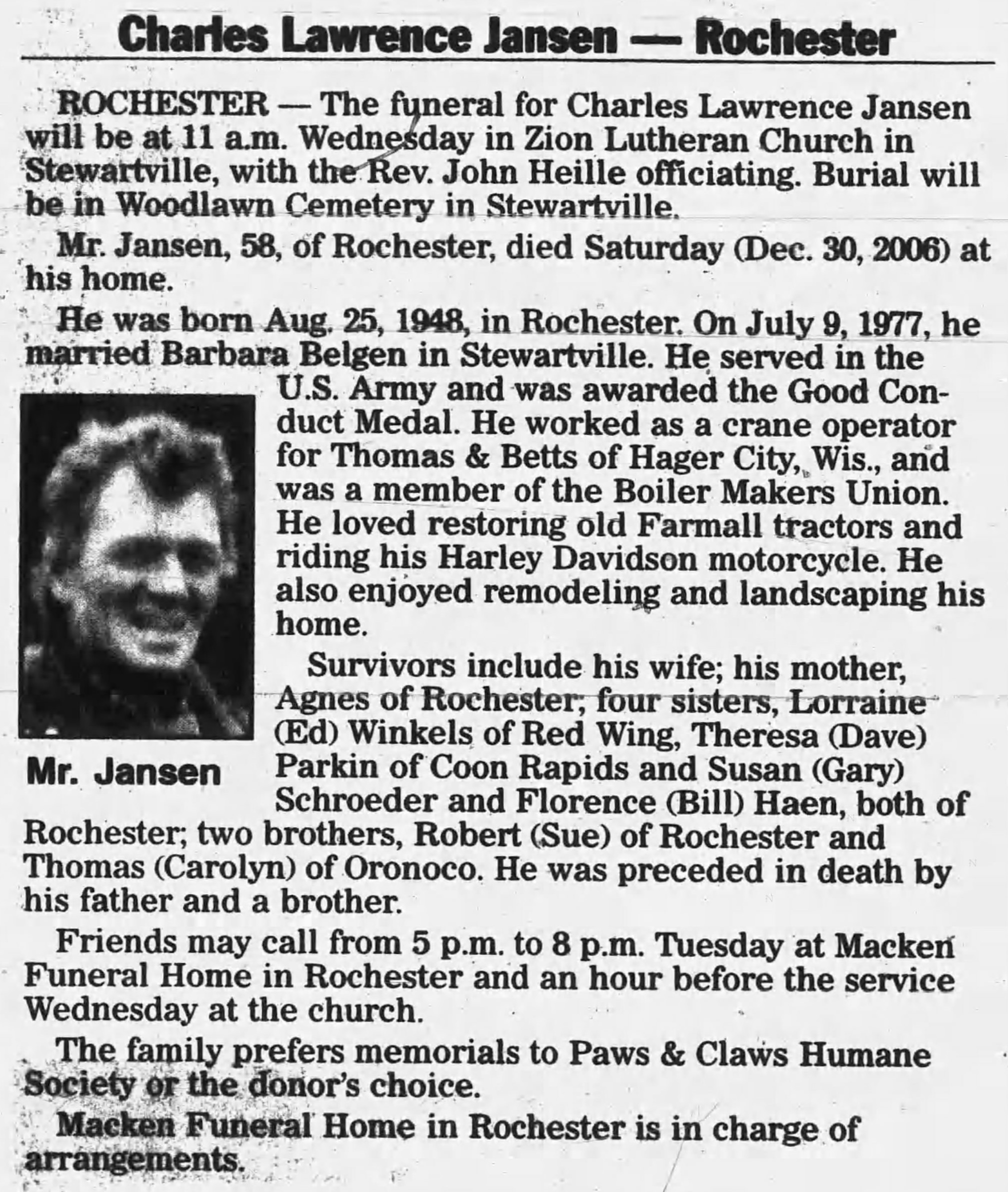 | Died: | December 30, 2006 in Rochester, Olmsted Co, MN. View Obituary |