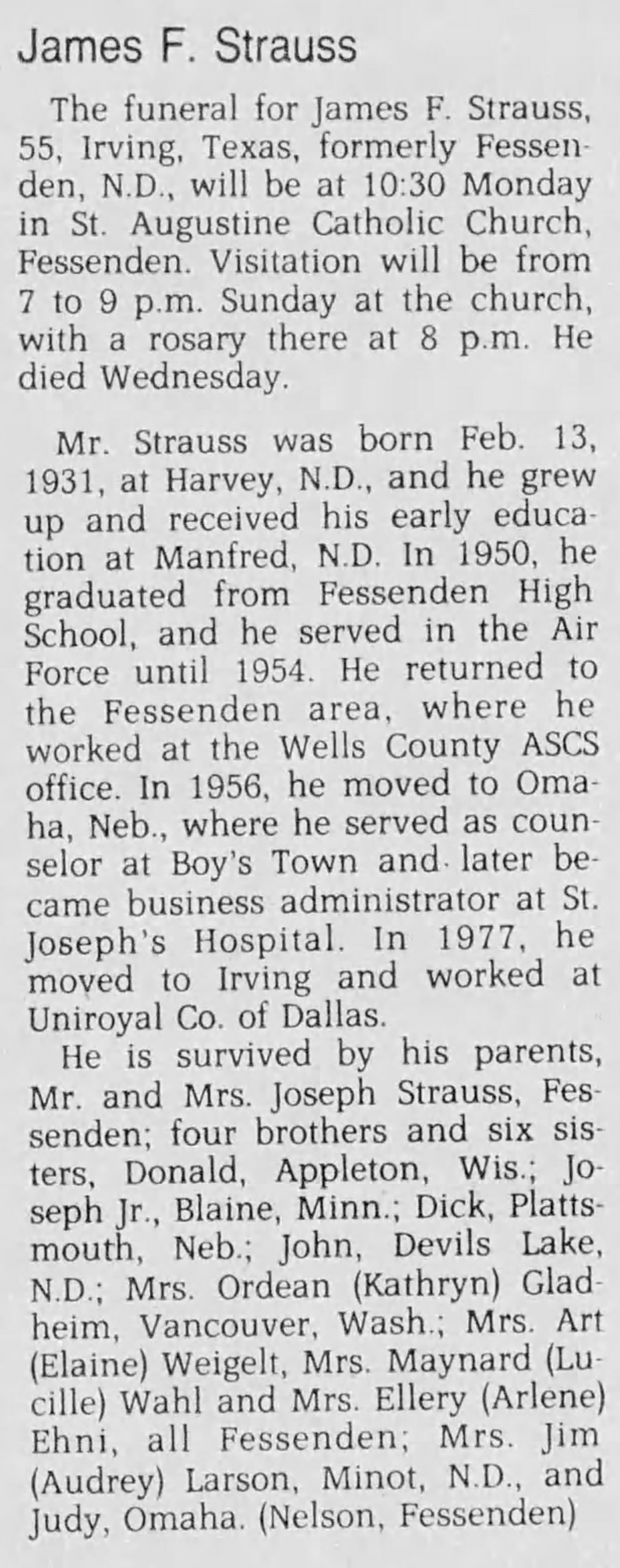 - 1950 Census - Manfred, Wells Co, ND (Listed as James F., age 19, son of Joseph H. Strauss)
