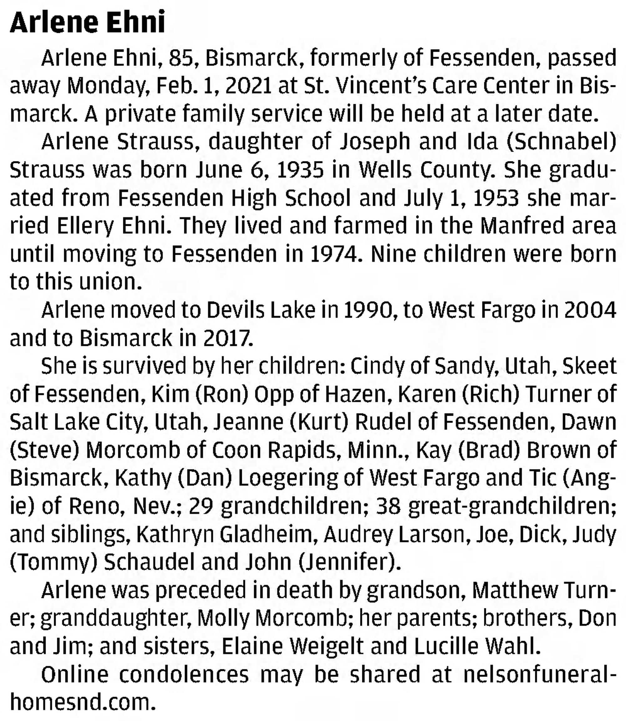 Arlene married Ellery Ehni on July 1, 1953 in Wells County, ND.