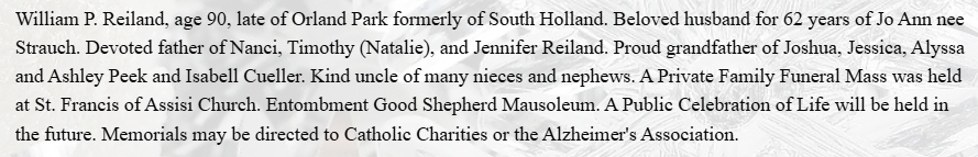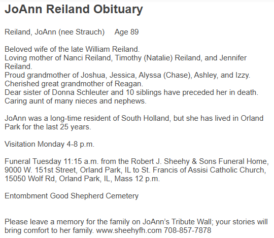 | Buried: | Good Shepherd Catholic Cemetery, Orland Park, Cook Co, IL. |