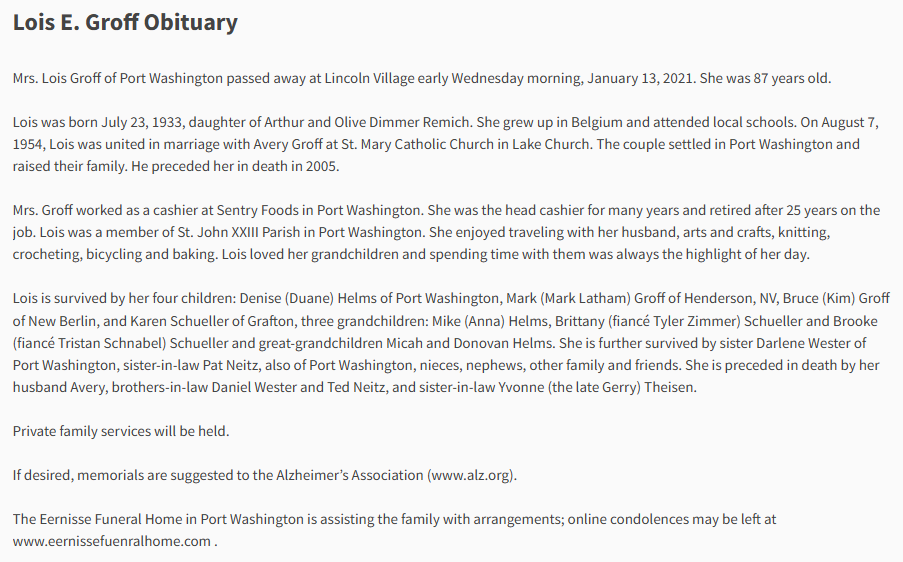 | Died: | January 13, 2021 in Port Washington, Ozaukee Co, WI. View Obituary |