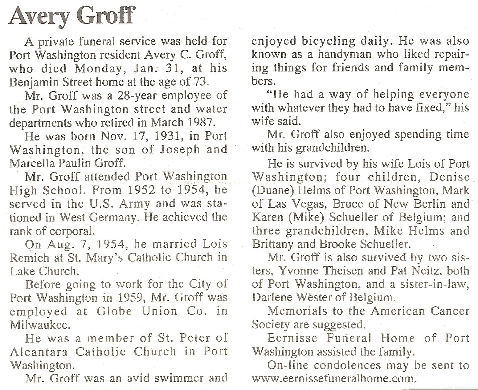 | Died: | January 31, 2005 in Port Washington, Ozaukee Co, WI. View Obituary |