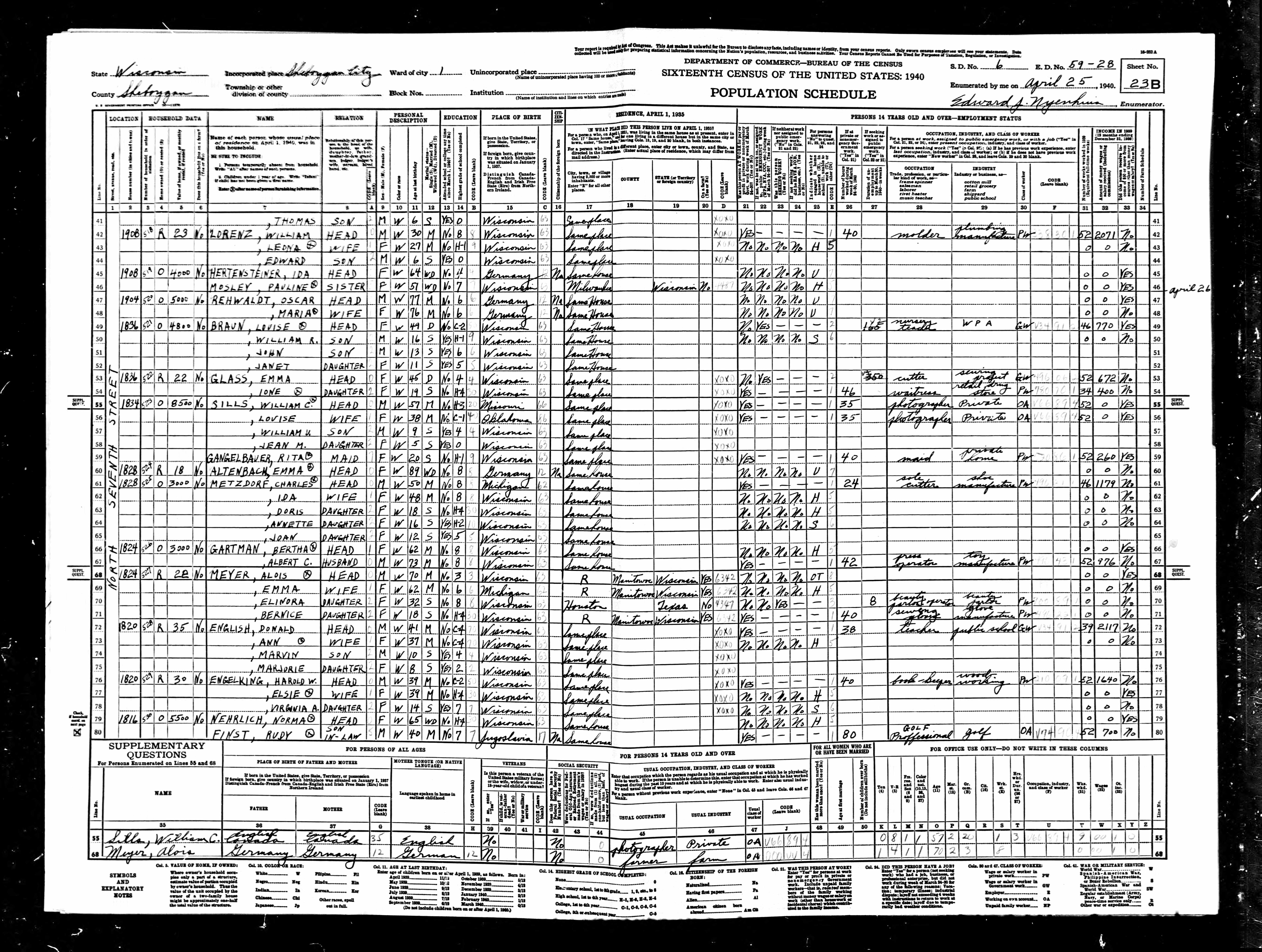 - 1950 Census - Kohler, Sheboygan Co, WI (Listed as Thomas, age 16, son of Arthur A. Hertensteiner)