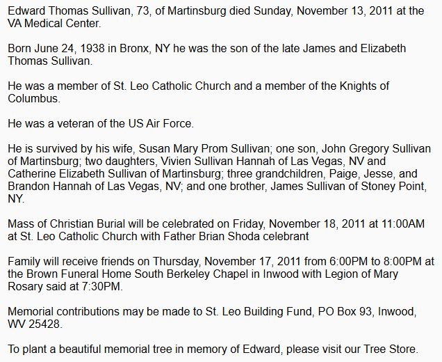 | Died: | November 13, 2011 in Martinsburg, Berkeley Co, WV. View Obituary |