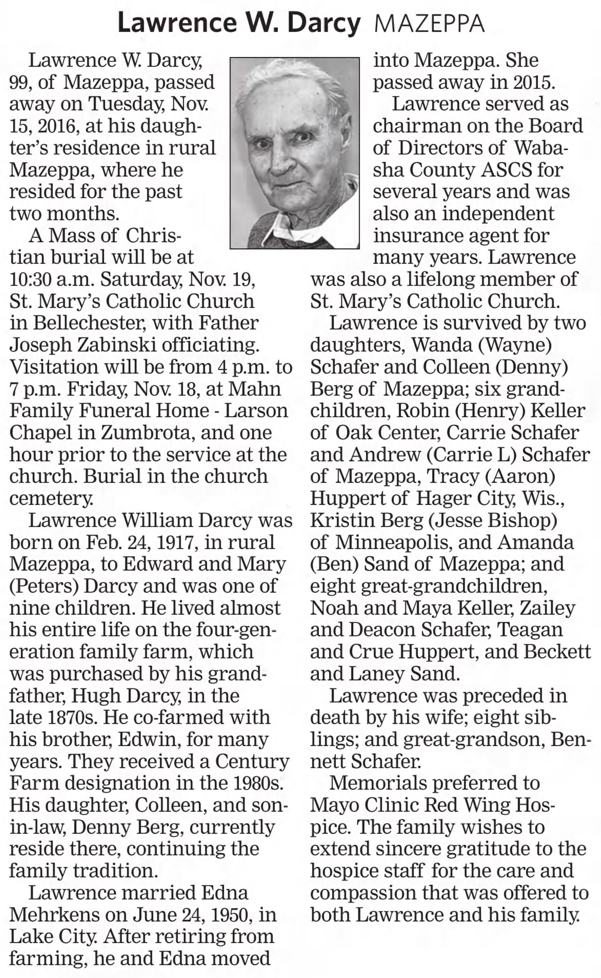 - 1930 Census - Chester Township, Wabasha Co, MN (Listed as Lawrence, age 13, son of Edward A. Darcy)