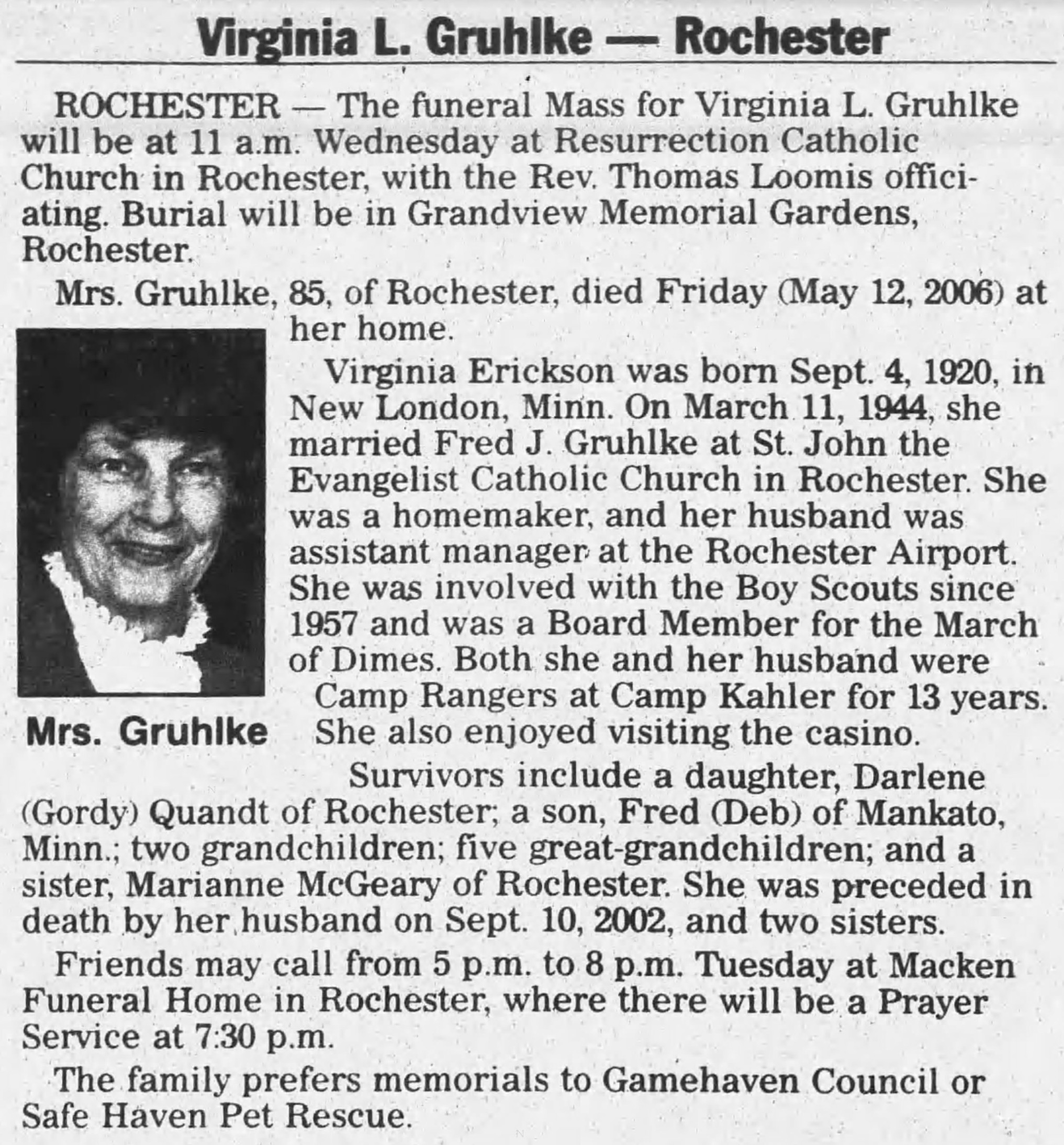 - 1930 Census - Rochester, Olmsted Co, MN (Listed as Frederick J., age 9, son of Fred M. Gruhlke)