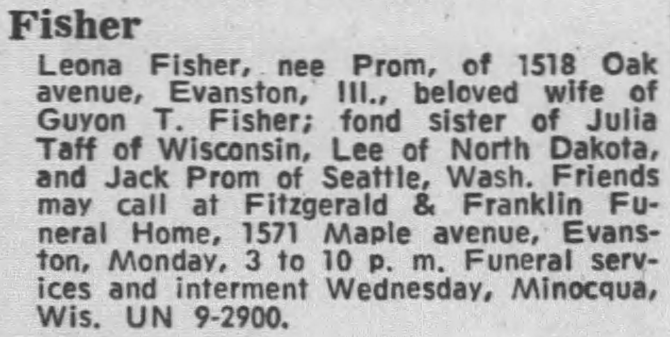 - 1950 Census - Chicago, Cook Co, IL (Listed as Leona, age 46, wife of Guyon T. Fisher)