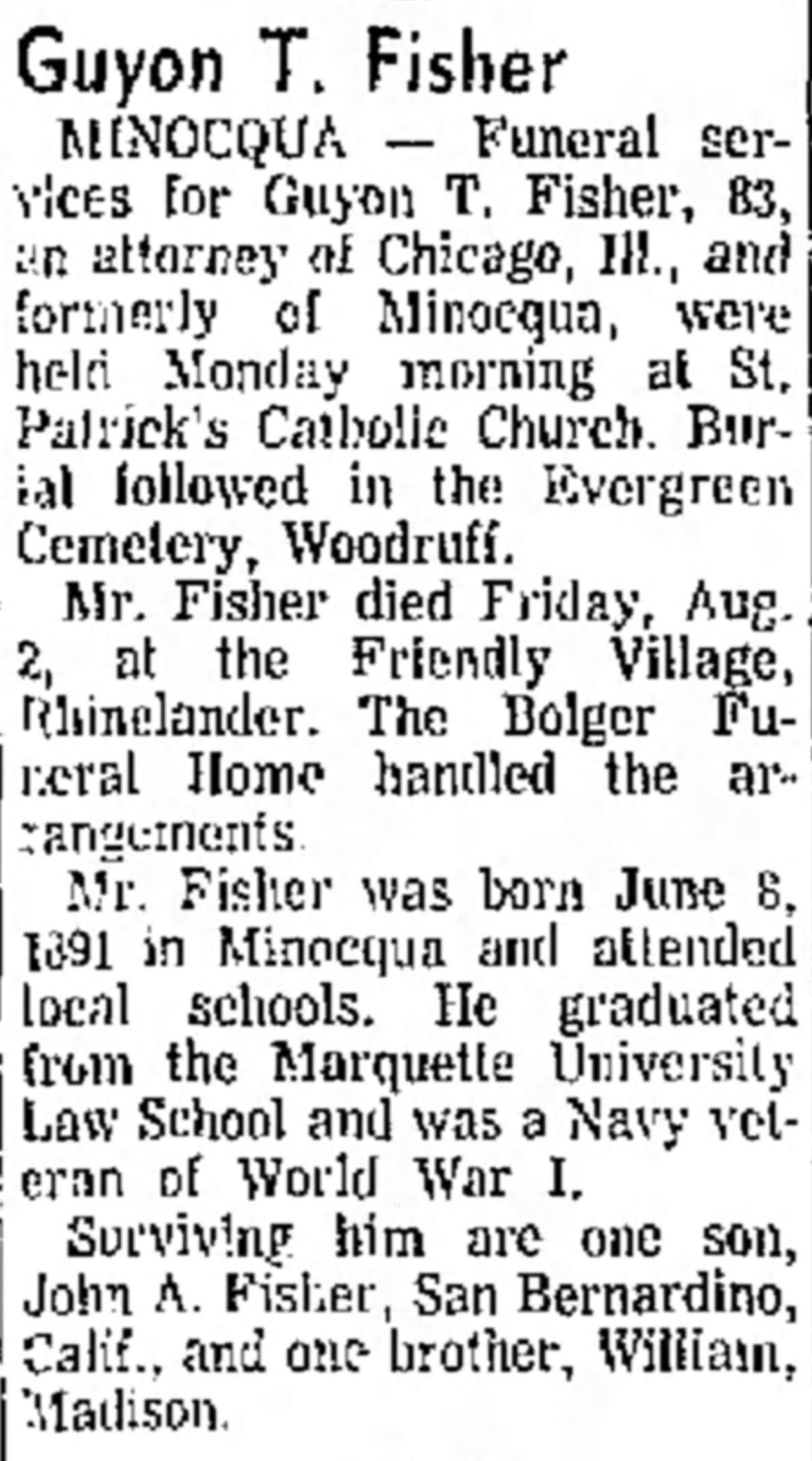 | Died: | August 2, 1974 in Rhinelander, Oneida Co, WI. View Obituary |