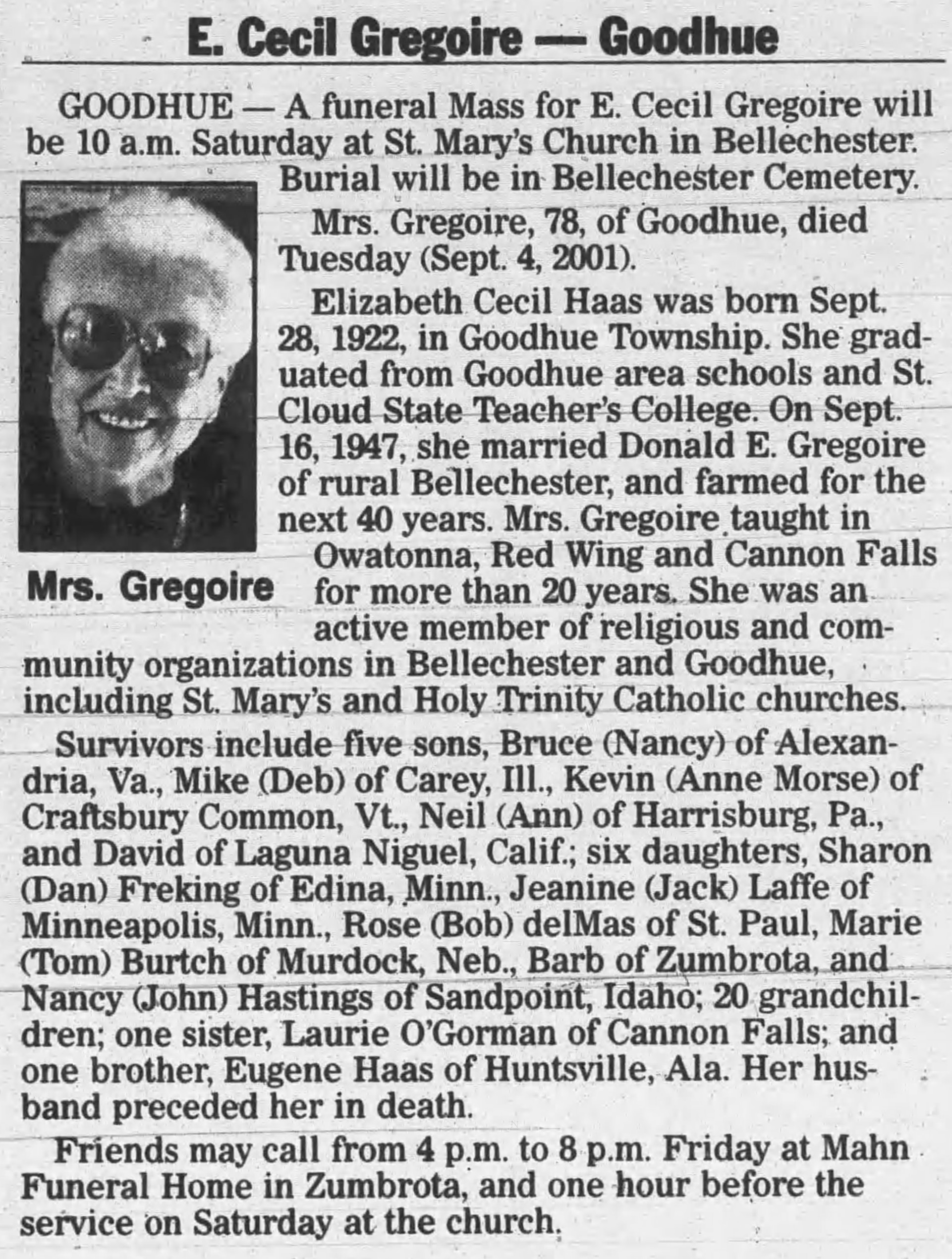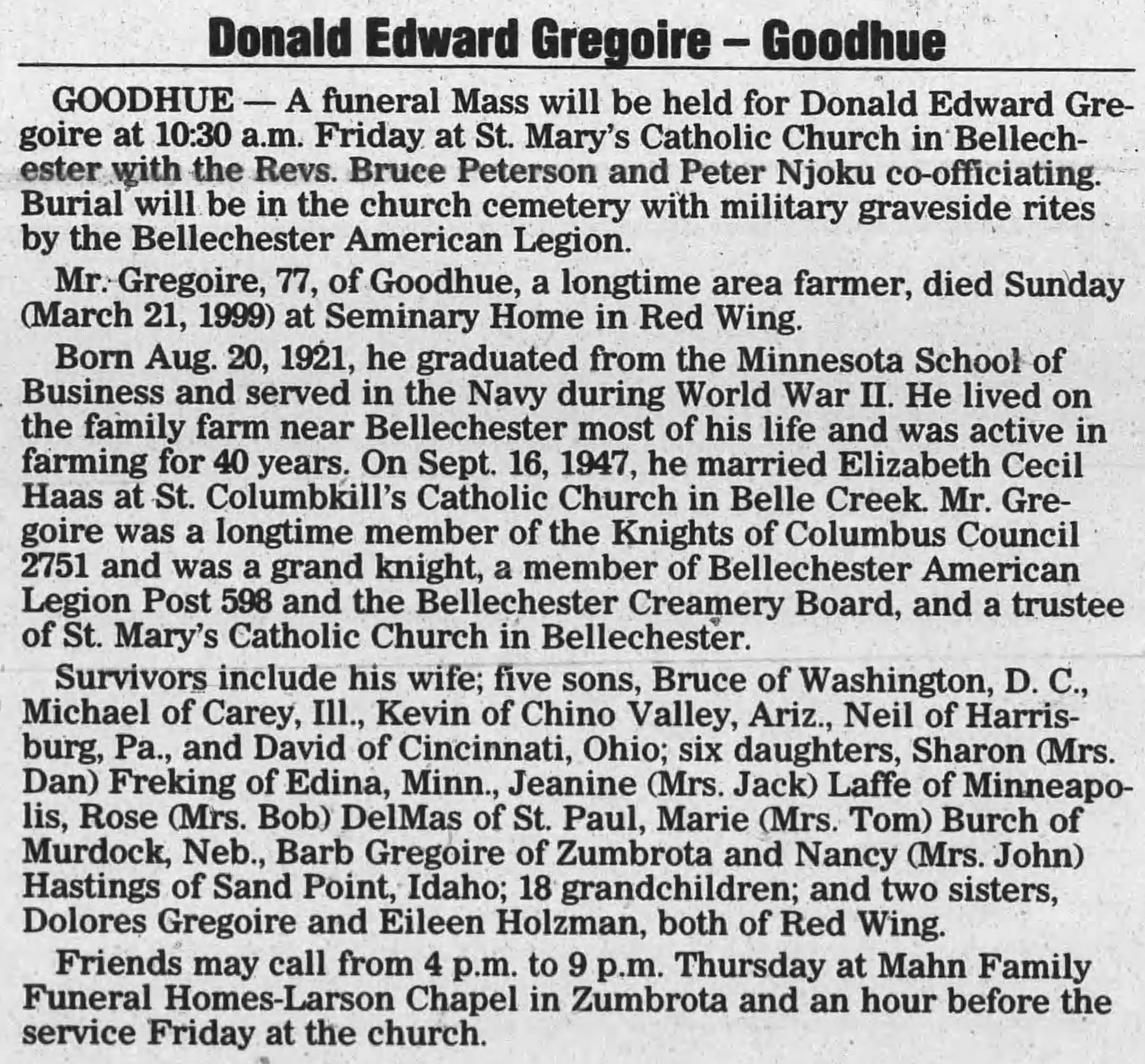 - 1940 Census - Goodhue, Goodhue Co, MN (Listed as E. Donald, age 18, son of C. Arthur Gregoire)