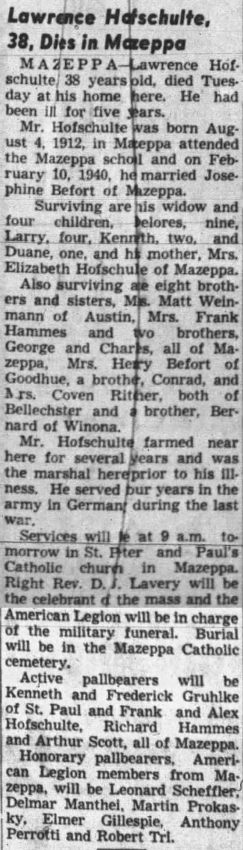 - 1950 Census - Mazeppa, Wabasha Co, MN (Listed as Josephine M., age 35, wife of Lawrence J. Hofschulte)