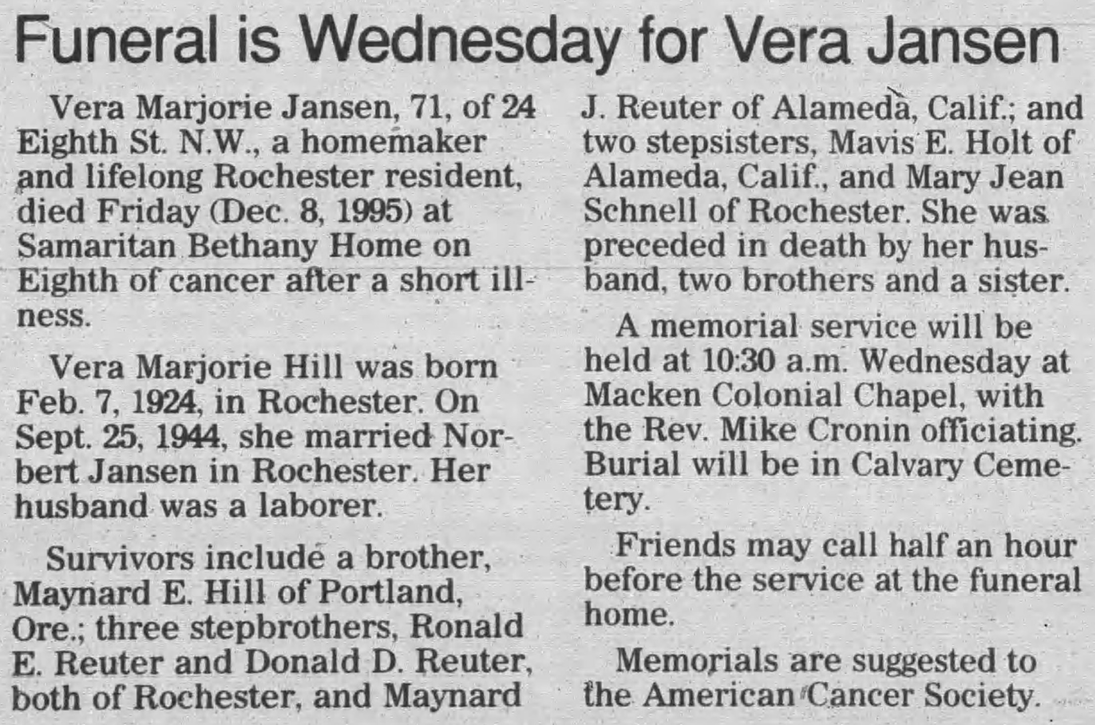 | Died: | December 8, 1995 in Rochester, Olmsted Co, MN. View Obituary |