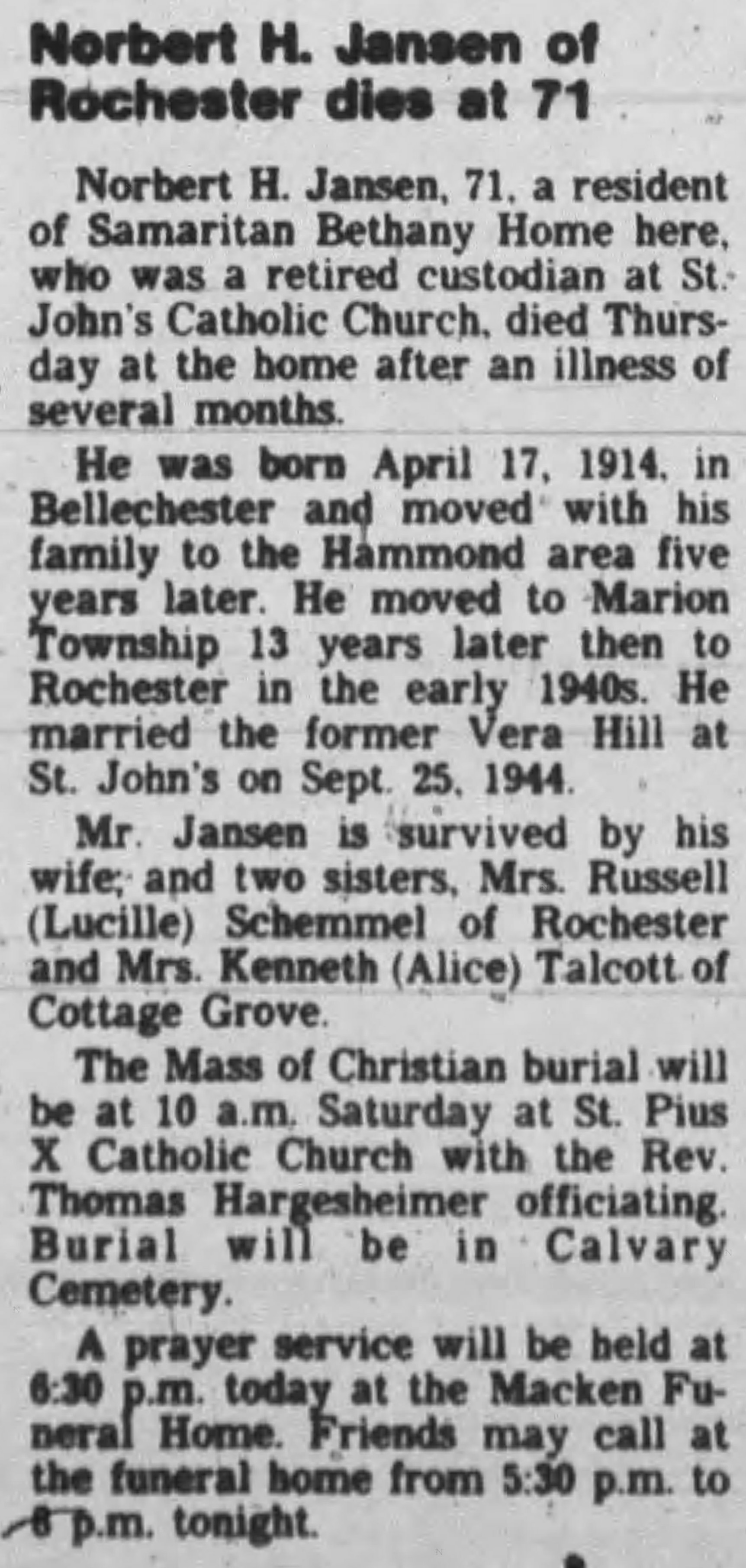 Norbert married Vera Marjorie Hill on September 25, 1944 in Rochester, Olmsted Co, MN.