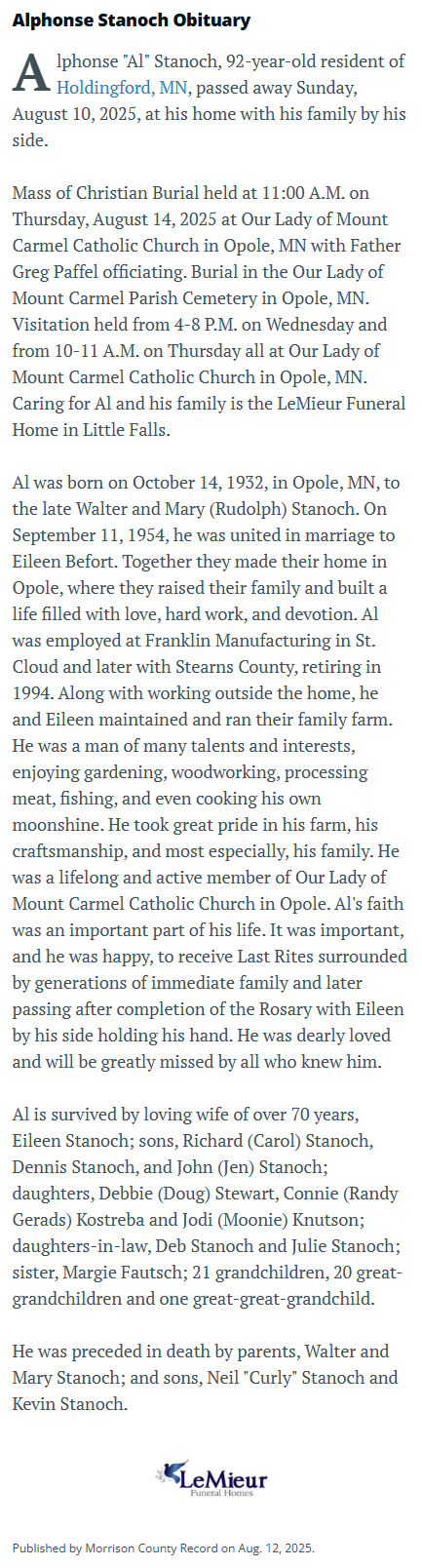 | Died: | August 10, 2025 in Holdingford, Stearns Co, MN. View Obituary |