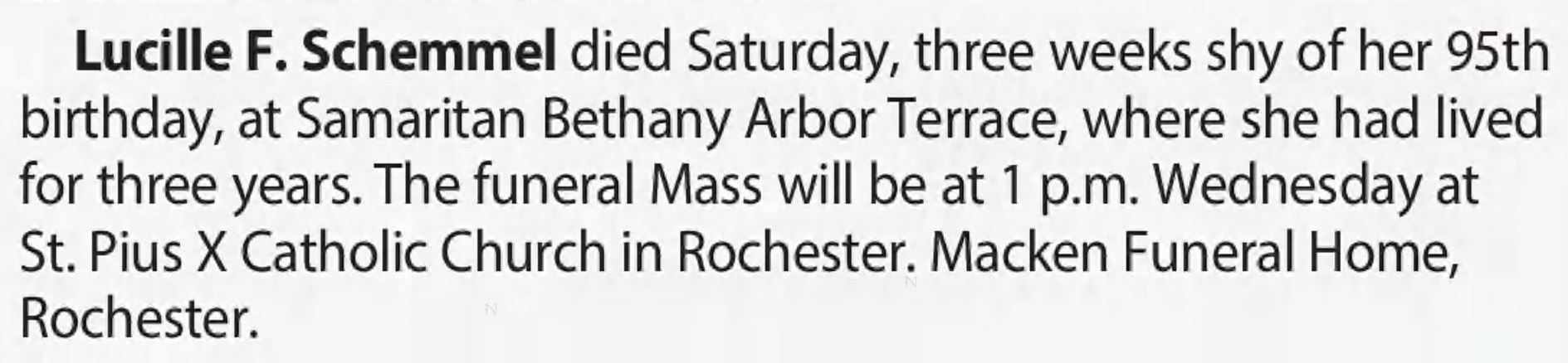 - 1950 Census - Rochester, Olmsted Co, MN (Listed as Lucille F., age 30, wife of Russell E. Schemmel)