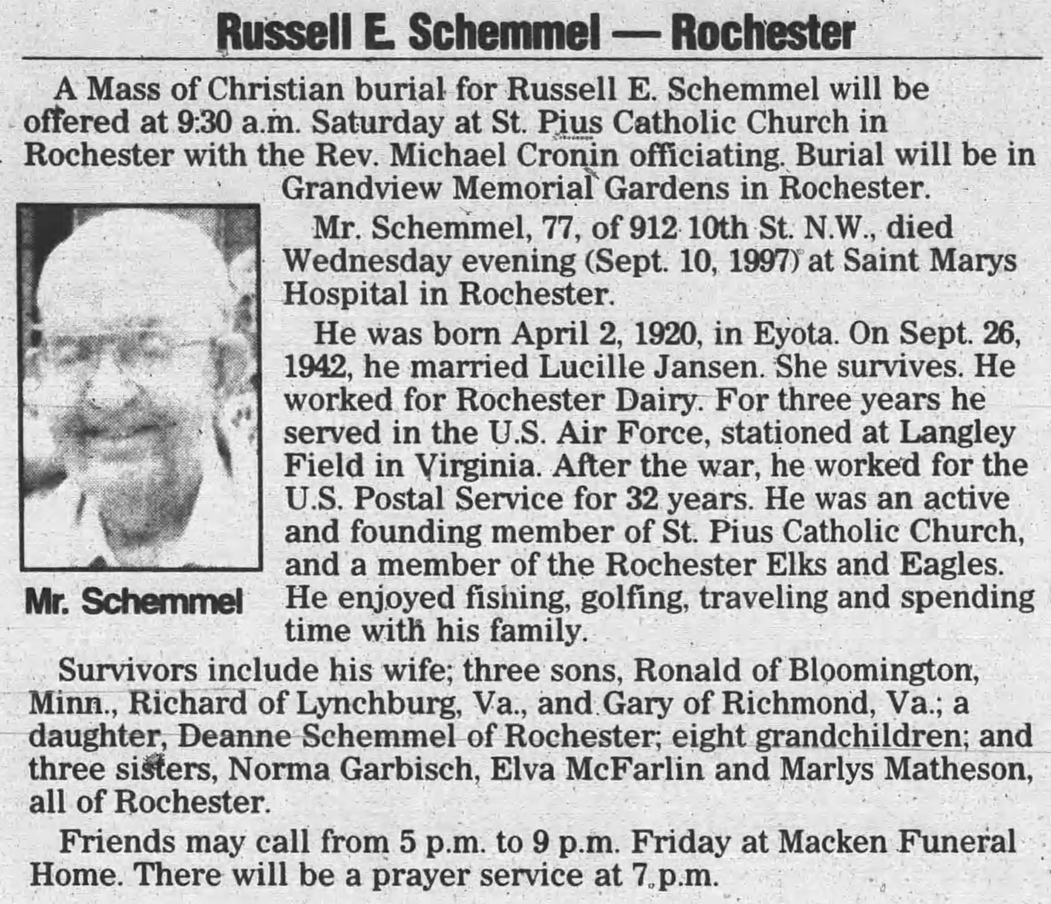Lucille married Russell Edward Schemmel on September 26, 1942 in Rochester, Olmsted Co, MN.