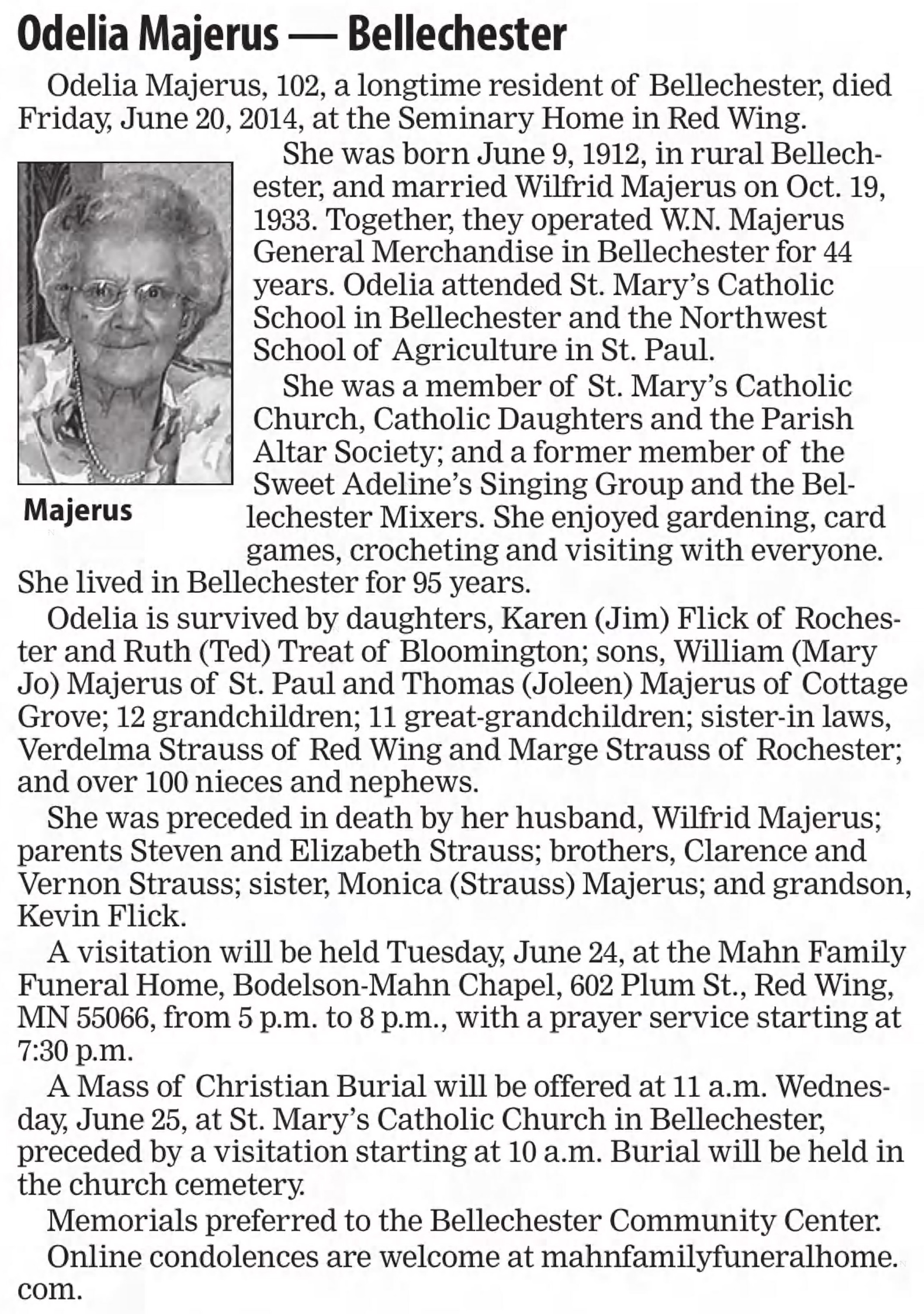 Odelia married Wilfred Nicholas Majerus on October 19, 1933 in Bellechester, Goodhue Co, MN.