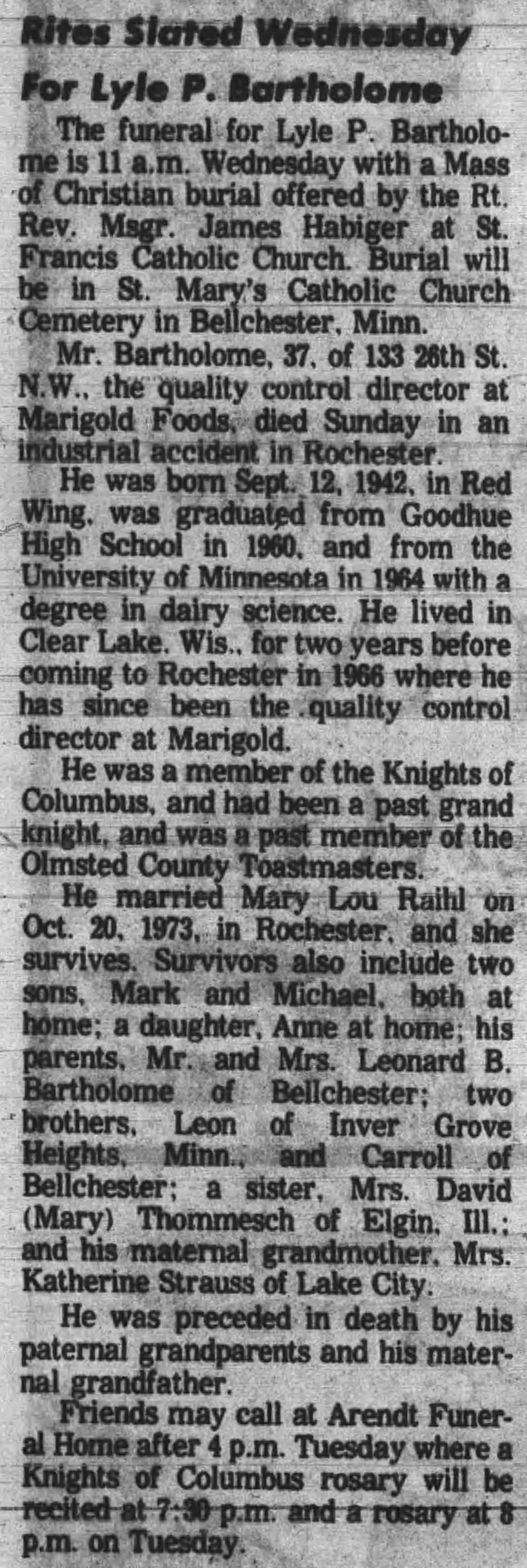 - 1950 Census - Chester Township, Wabasha Co, MN (Listed as Lyle P., age 7, son of Leonard W. Bartholome)
