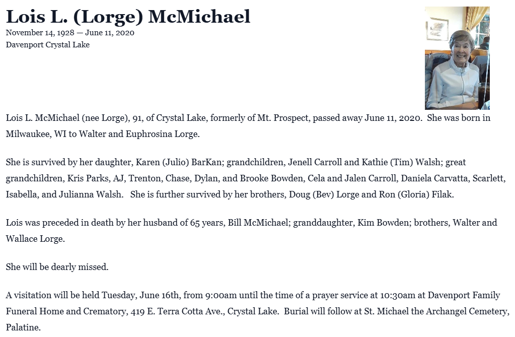 | Buried: | St. Michael the Archangel Catholic Cemetery, Palatine, Cook Co, IL. |