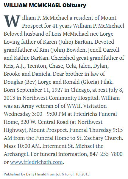 | Died: | July 8, 2013 in Arlington Heights, Cook Co, IL. View Obituary |