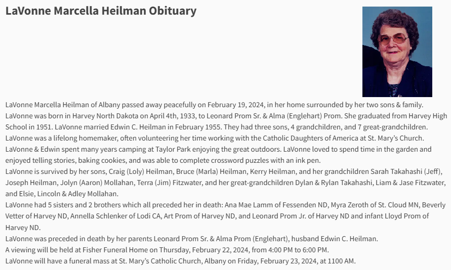 - 1950 Census - Wells Township, Wells Co, ND (Listed as Lavonne, age 17, daughter of Leonard Prom)