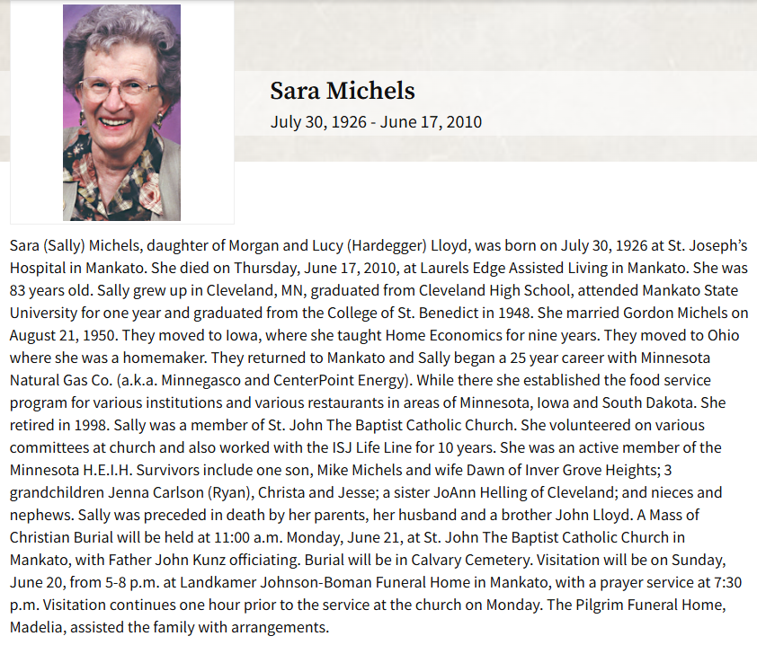 | Died: | June 17, 2010 in Mankato, Blue Earth Co, MN. View Obituary |
