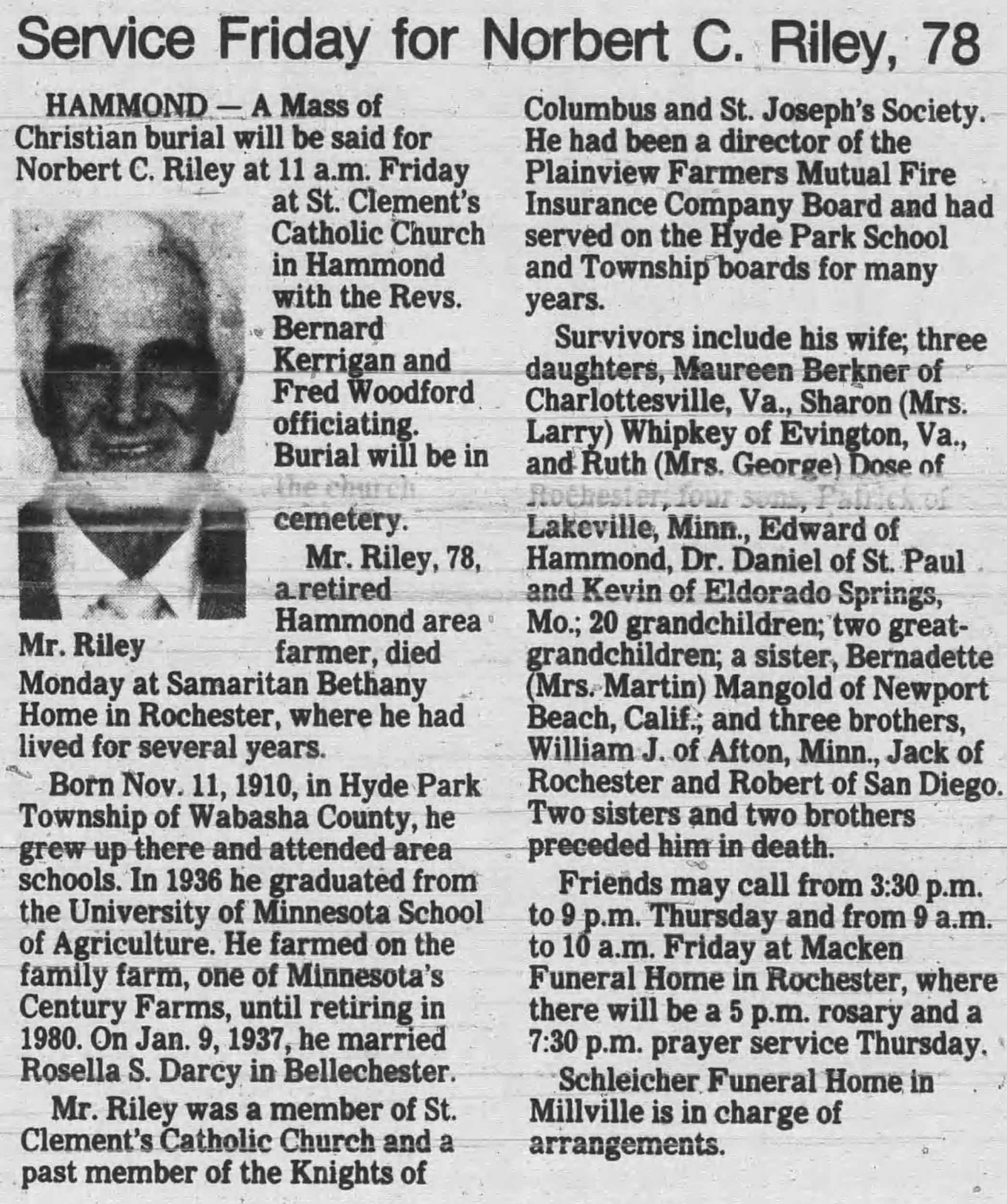 | Buried: | St. Clement's Cemetery, Hammond, Wabasha Co, MN. |