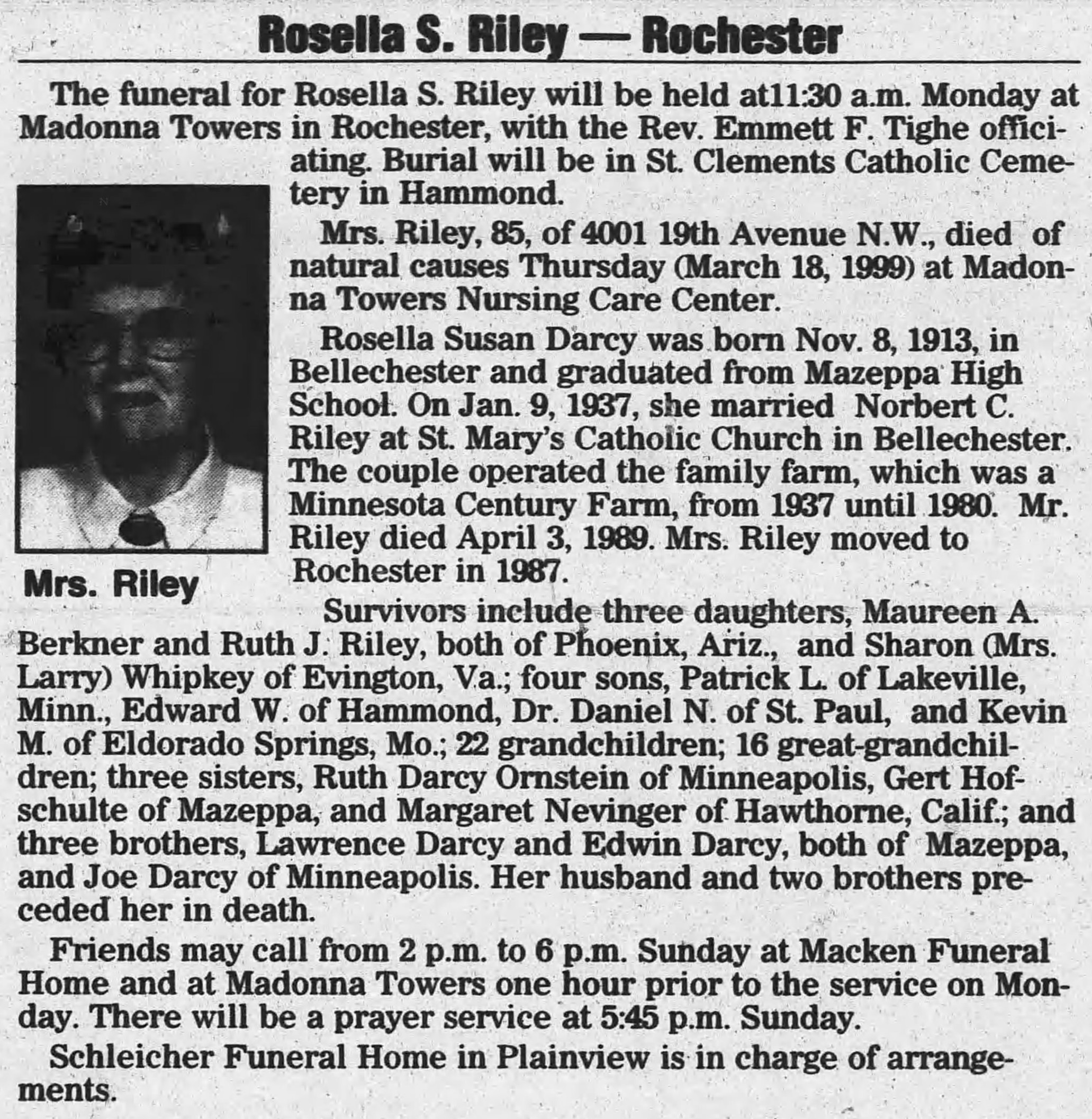- 1950 Census - Hyde Park Township, Wabasha Co, MN (Listed as Rosella S., age 36, wife of Norbert C. Riley)