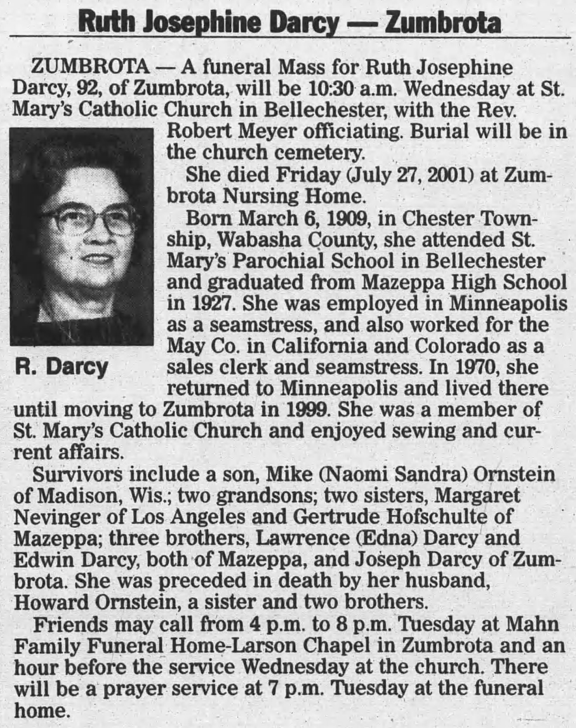 - 1930 Census - Minneapolis, Hennepin Co, MN (Listed as Ruth J. Darcy, age 21, servant of Joseph Abrams)
