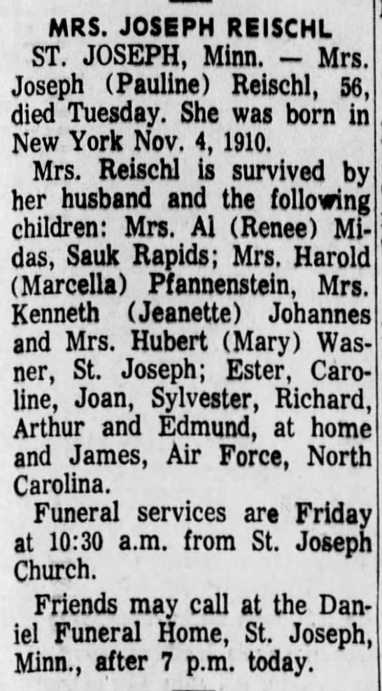 - 1940 Census - St. Joseph, Stearns Co, MN (Listed as Joseph S. Reischl, age 31, head of household)