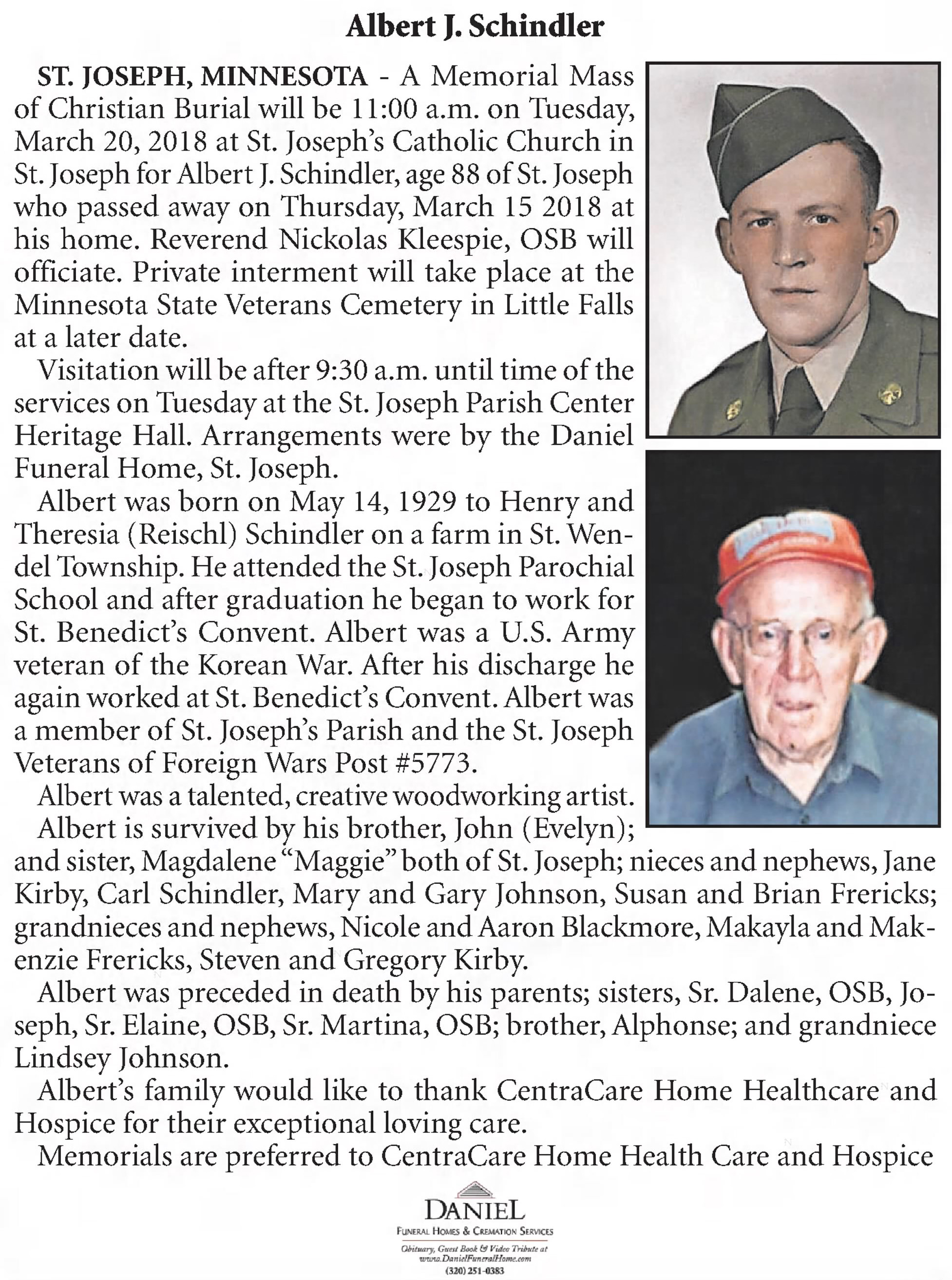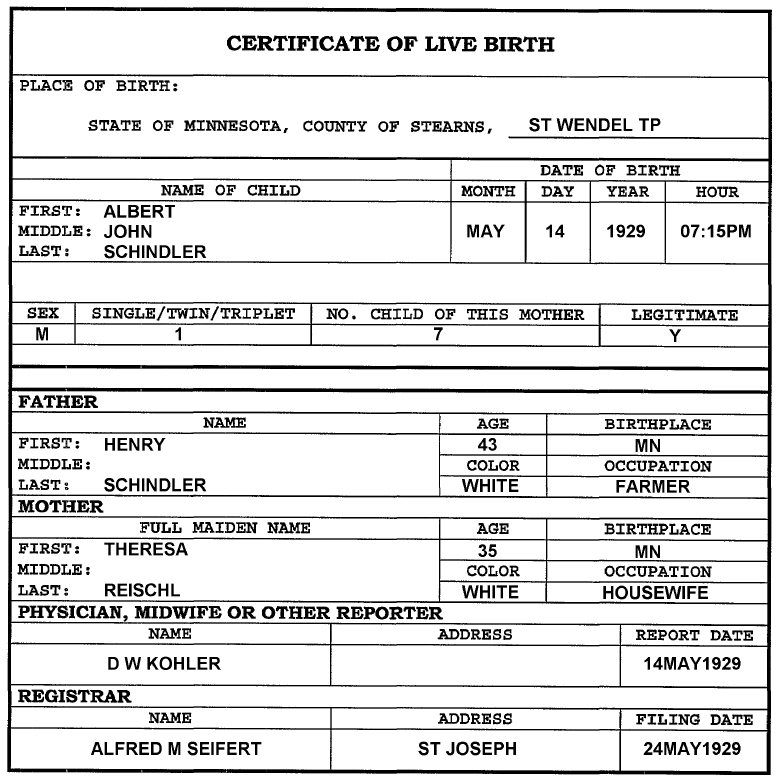 - 1940 Census - St. Joseph, Stearns Co, MN (Listed as Albert, age 10, son of Theresia Schindler)