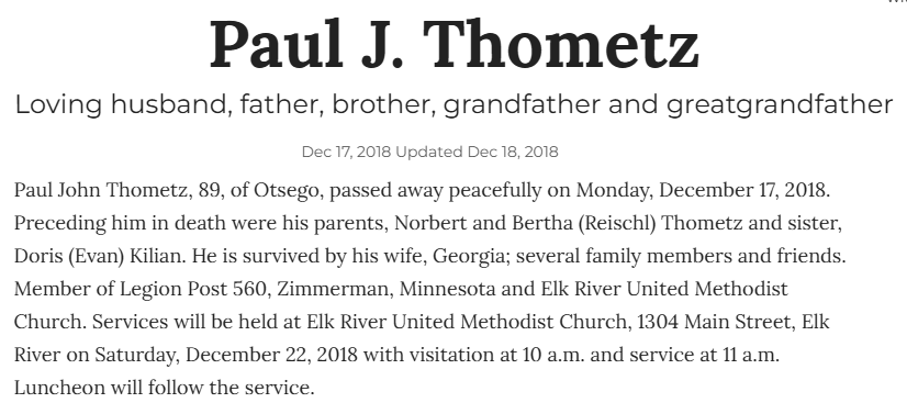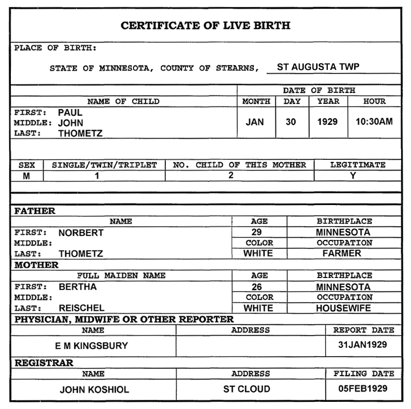 - 1930 Census - St. Augusta Township, Stearns Co, MN (Listed as Paul, age 1 2/12, son of Norbert Thometz)