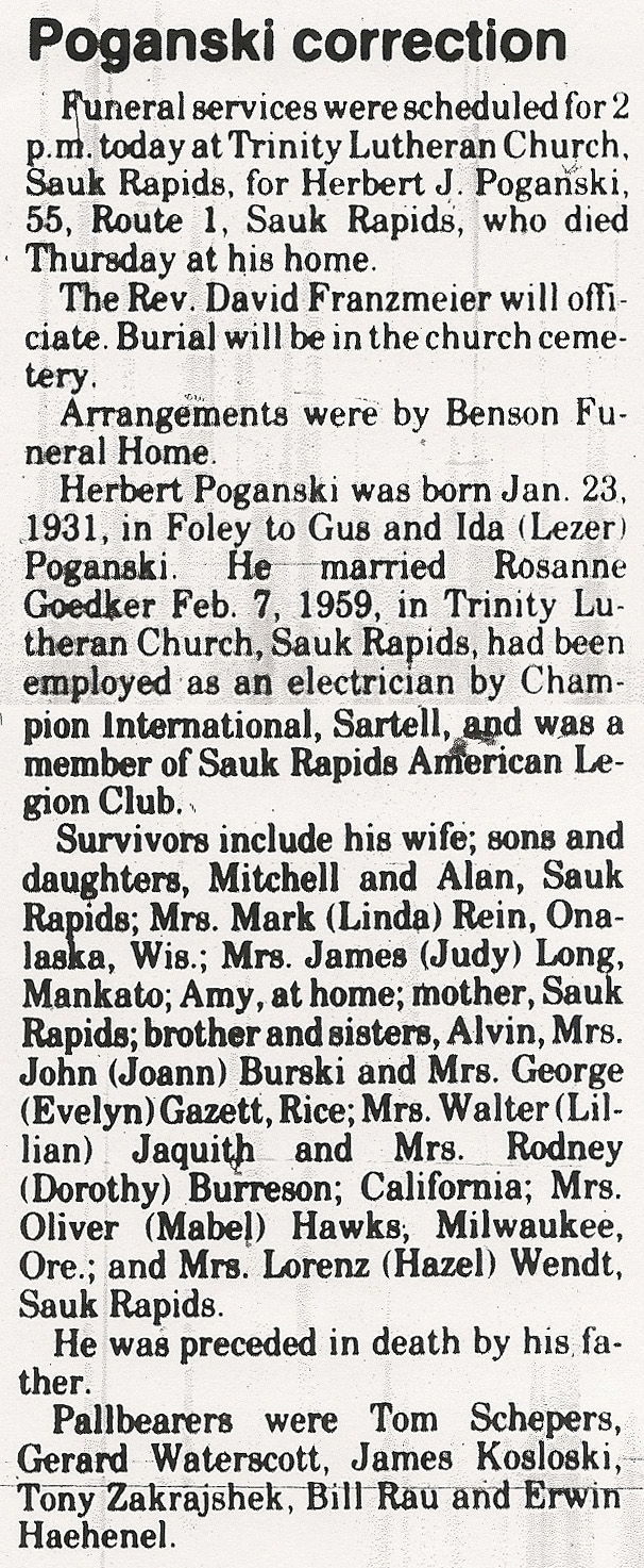 Rosanne married Herbert John Poganski on February 7, 1959 in Sauk Rapids, Benton Co, MN.