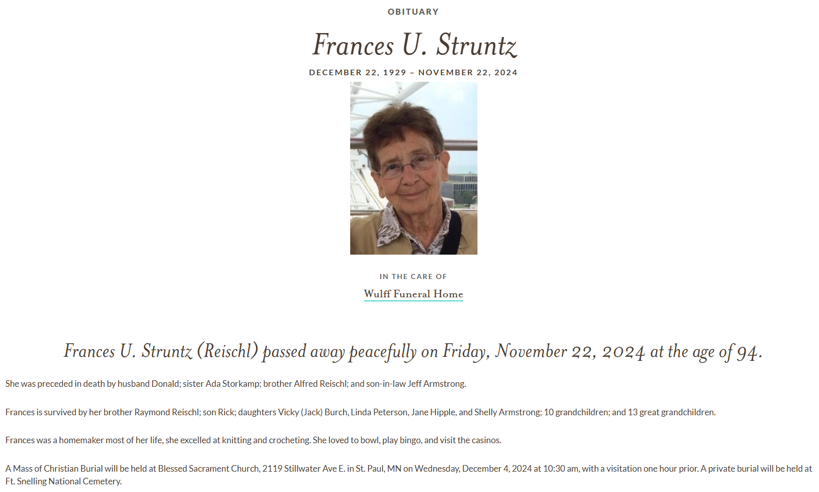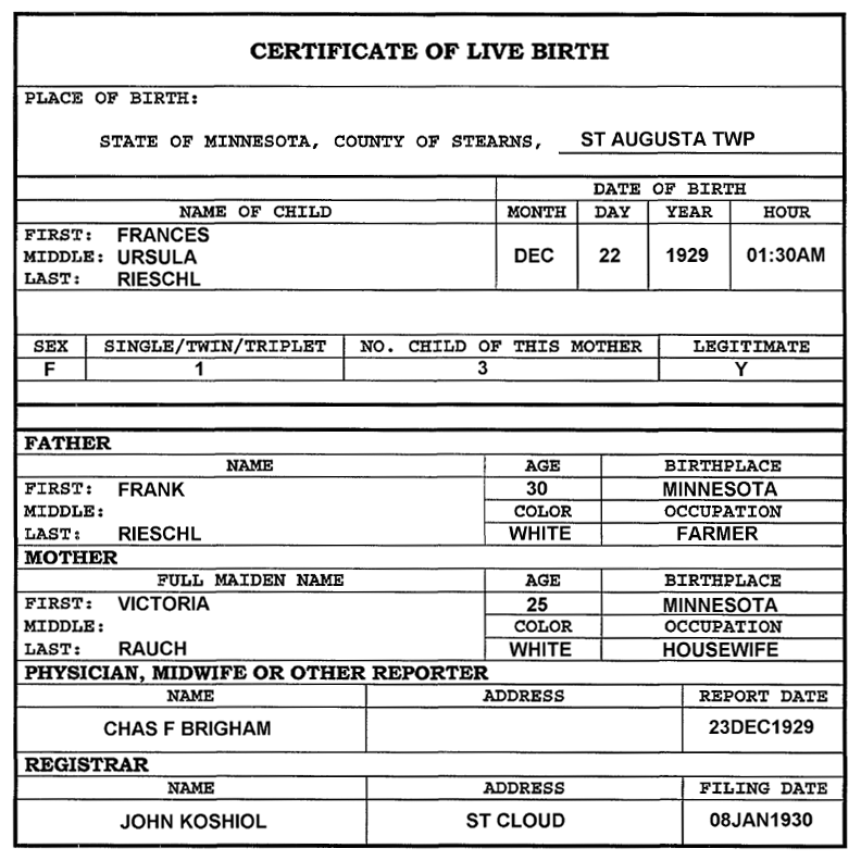 - 1940 Census - St. Augusta, Stearns Co, MN (Listed as Frances, age 10, daughter of Frank Reischl)