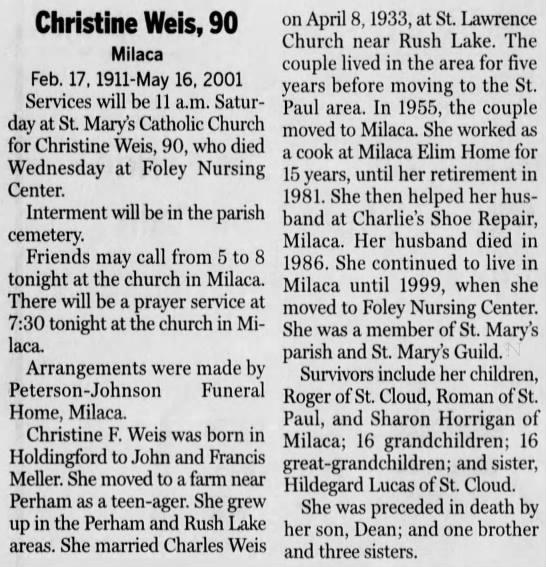 Christine married Charles Michael Weis on April 8, 1933 in Rush Lake, Otter Tail Co, MN.