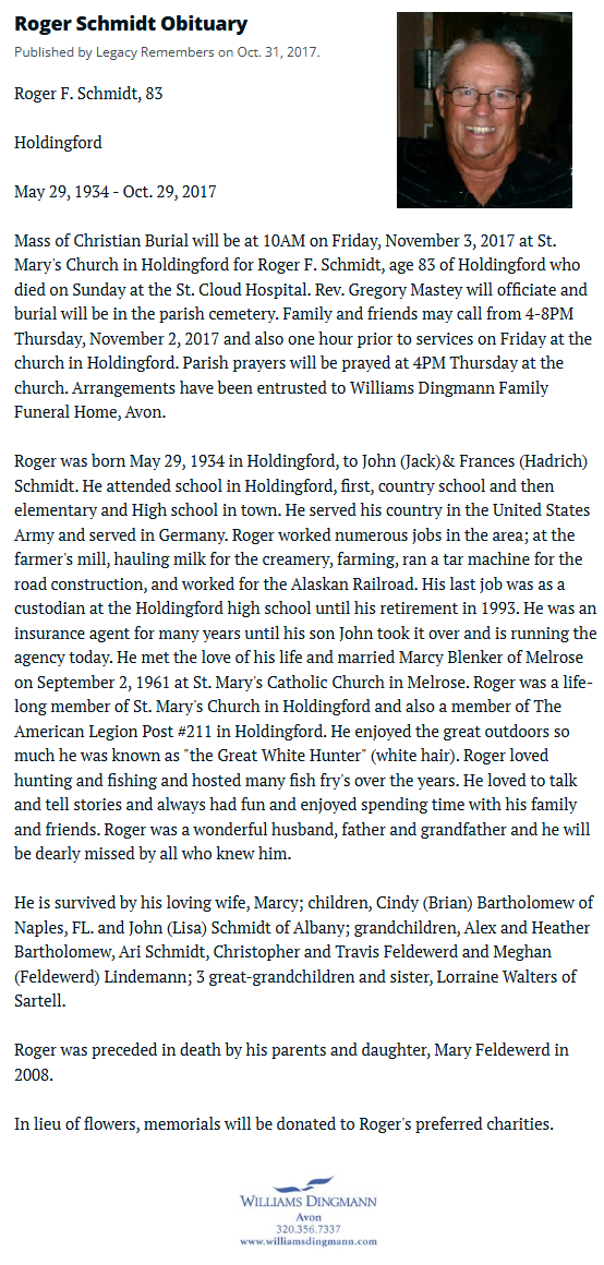 - 1940 Census - Holding Township, Stearns Co, MN (Listed as Roger, age 5, son of John Schmidt)