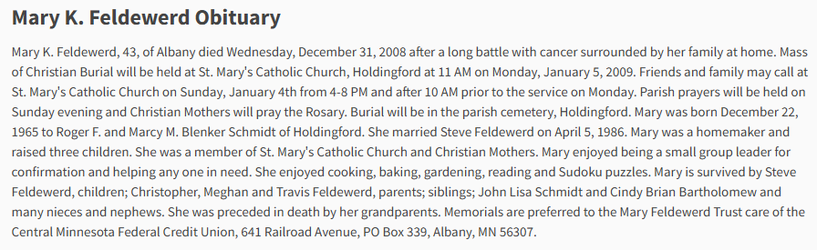 Mary married Steven Sylvester Feldewerd on April 5, 1986 in Holdingford, Stearns Co, MN.