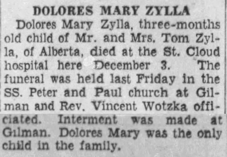 | Buried: | St. Peter and Paul Cemetery, Gilman, Benton Co, MN. |