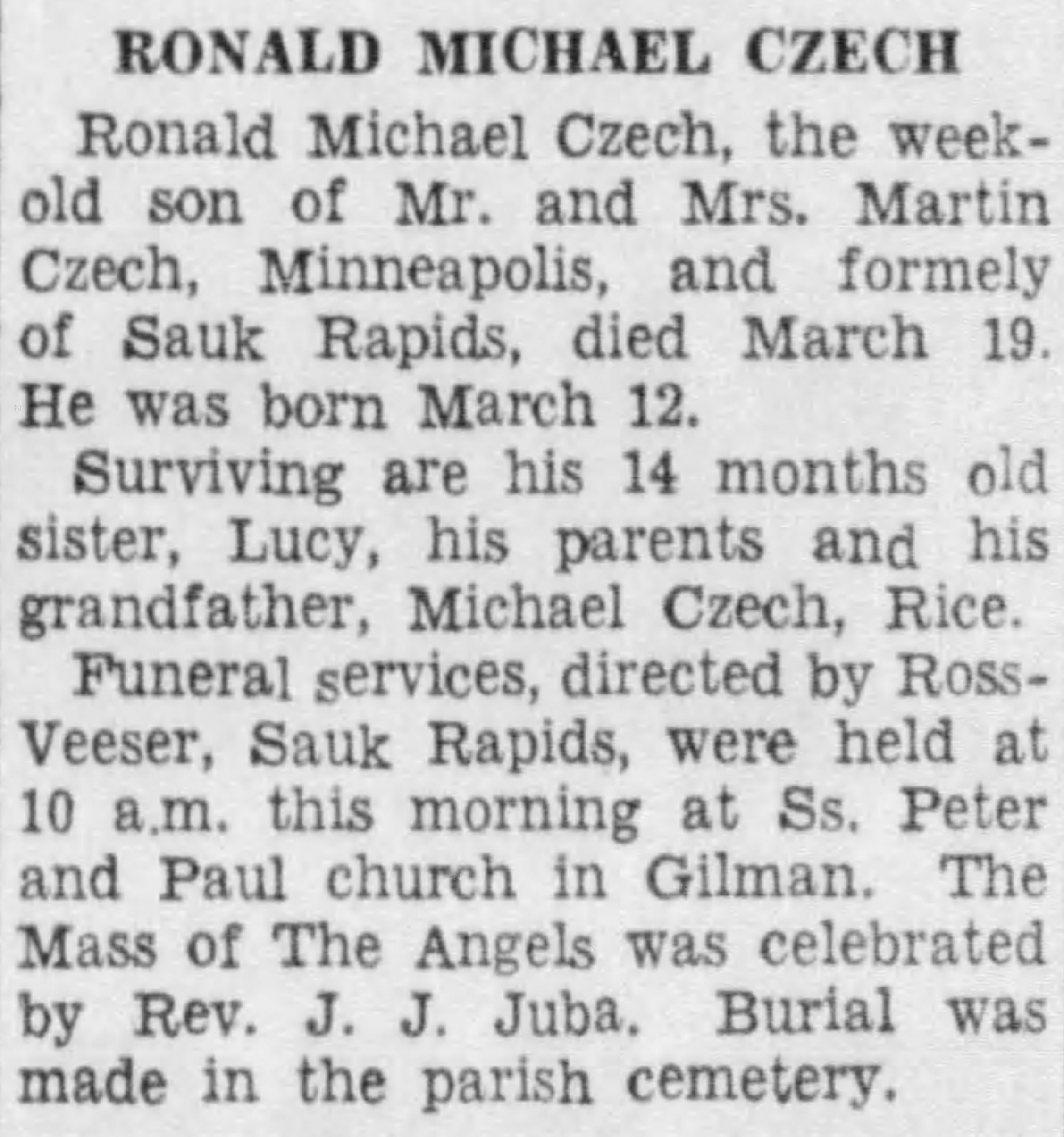 Buried: | St. Peter and Paul Cemetery, Gilman, Benton Co, MN. |