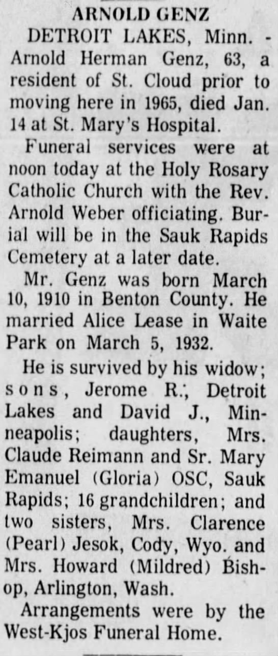 Alice married Arnold Herman Genz on April 5, 1932 in Waite Park, Stearns Co, MN.