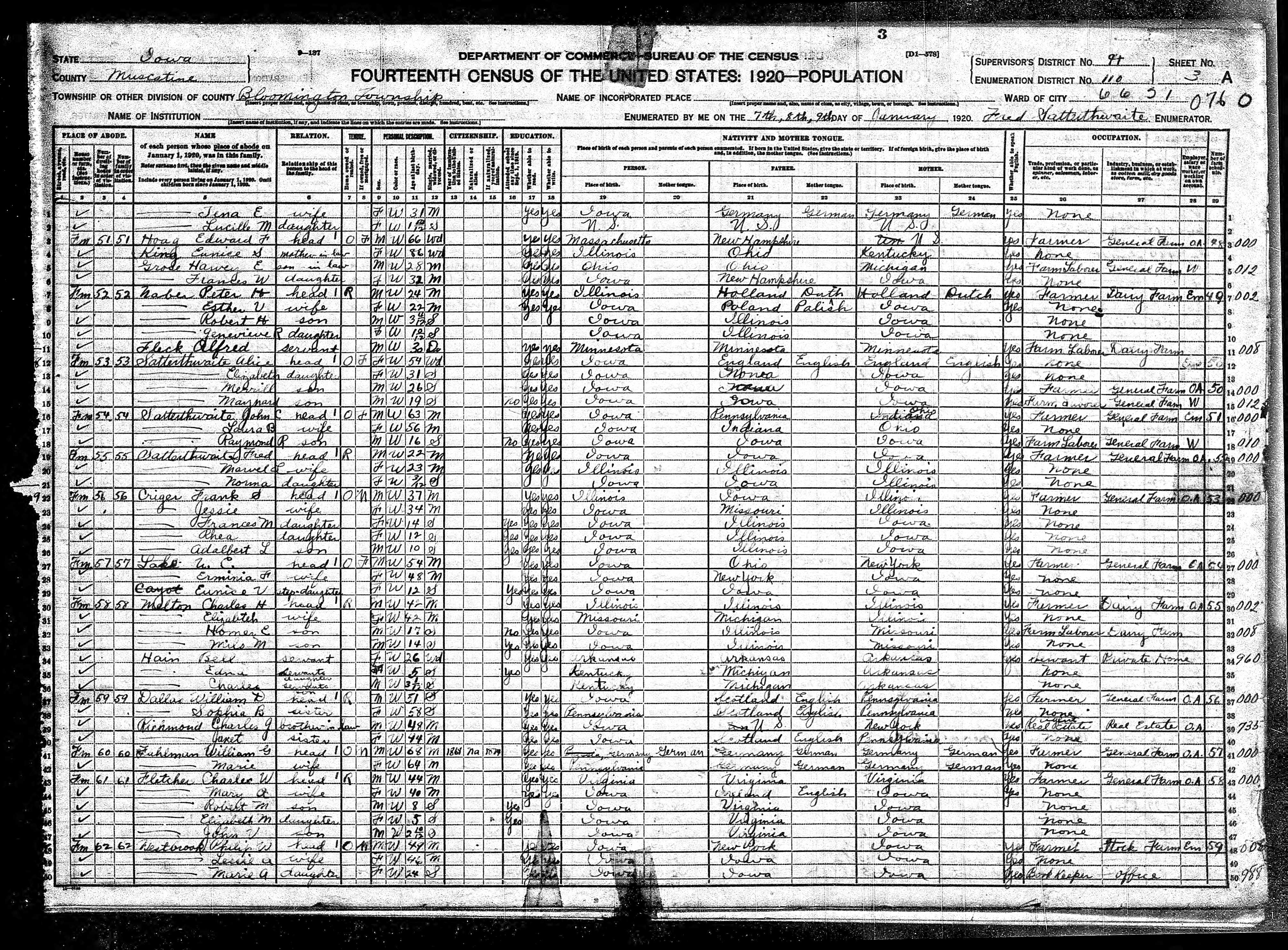 - 1920 Census - Bloomington Township, Muscatine Co, IA (Listed as Alfred Fleck, age 30, servant of Peter H. Naber)