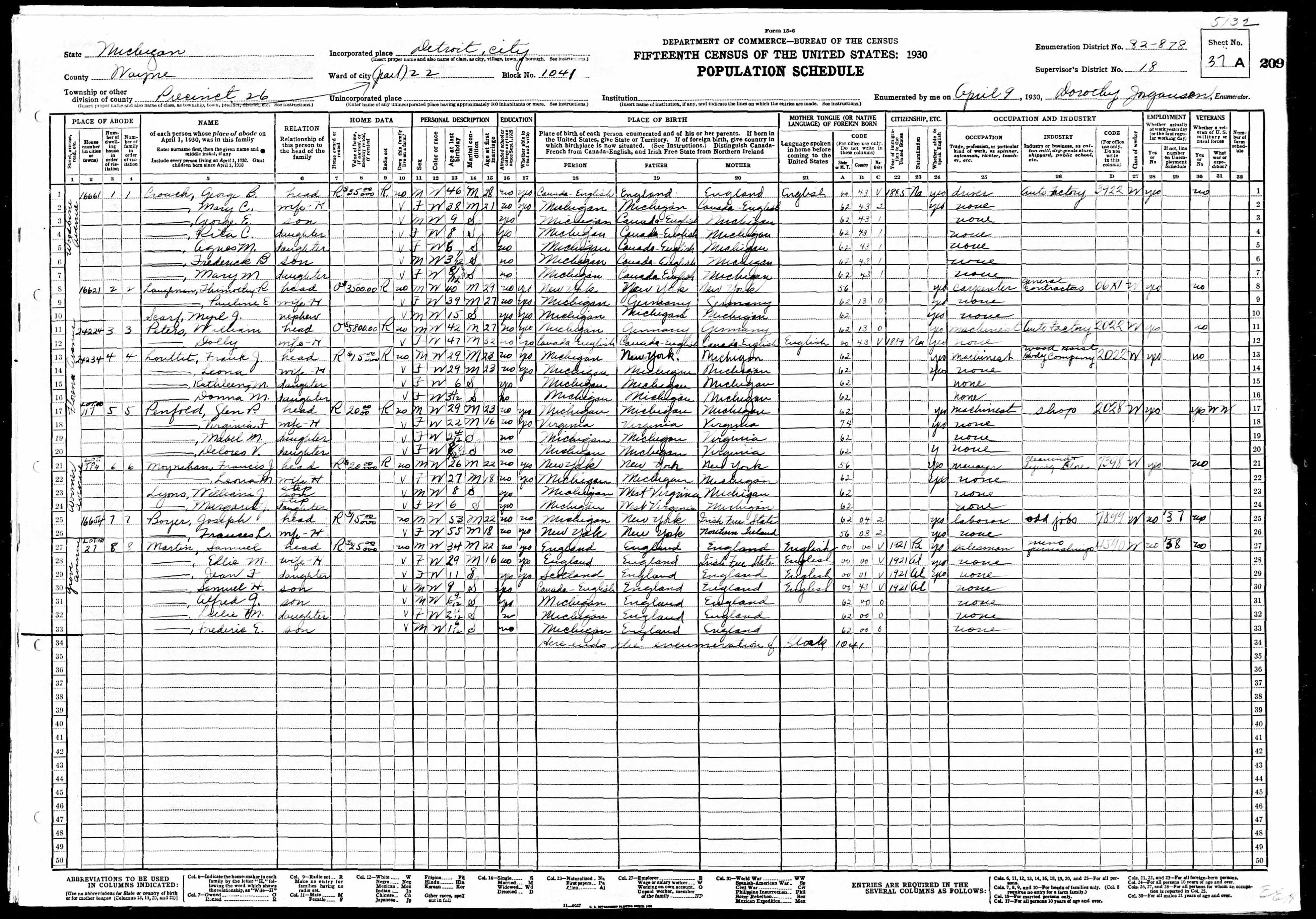 - 1930 Census - Detroit, Wayne Co, MI (Listed as Francis J. Moynihan, age 26, head of household)