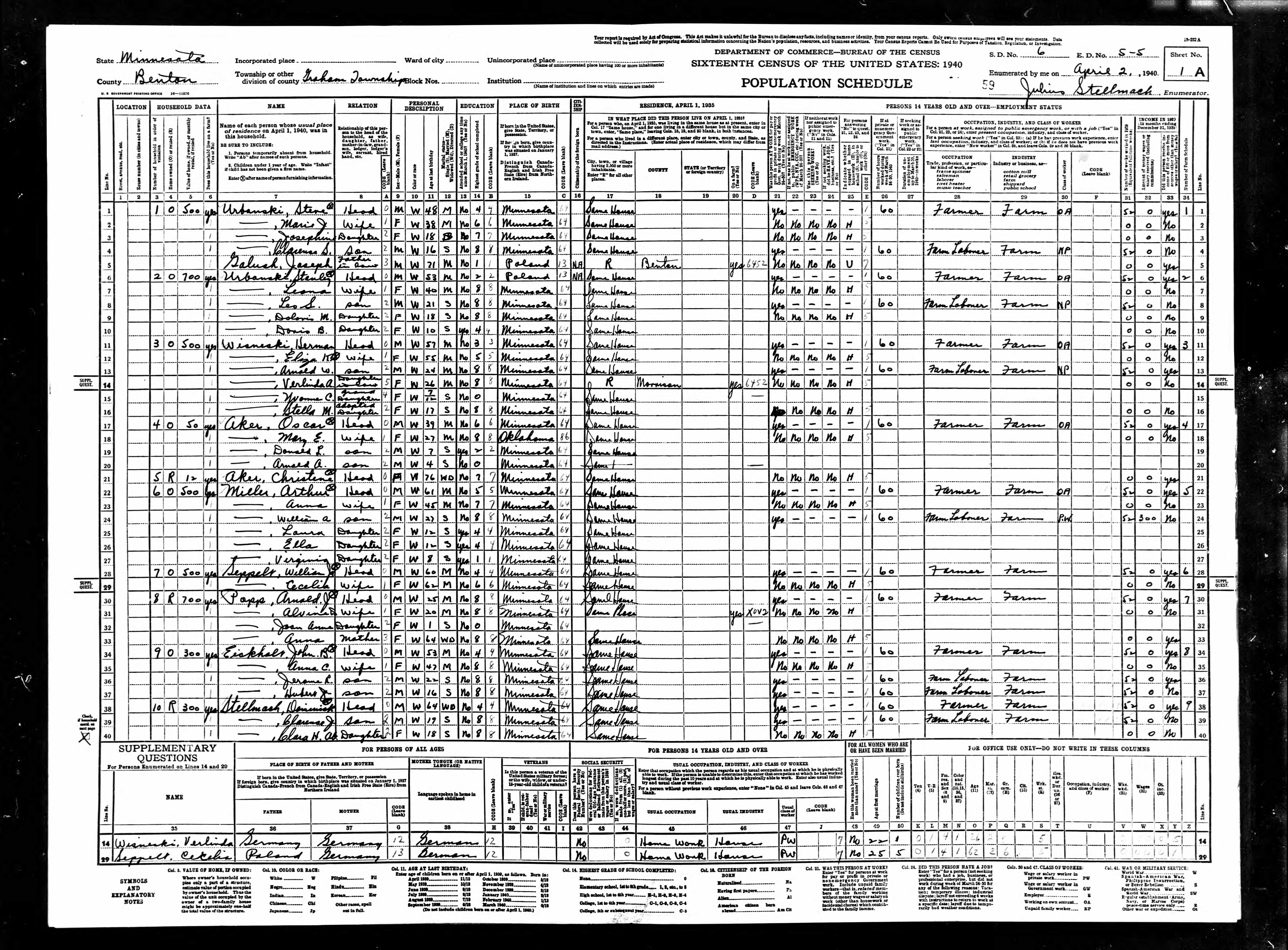 - 1940 Census - Graham Township, Benton Co, MN (Listed as Arthur, age 61, head of household)