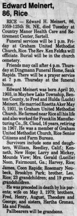 Rosetta married Edward Henry Meinert on May 5, 1931 in Benton County, MN.