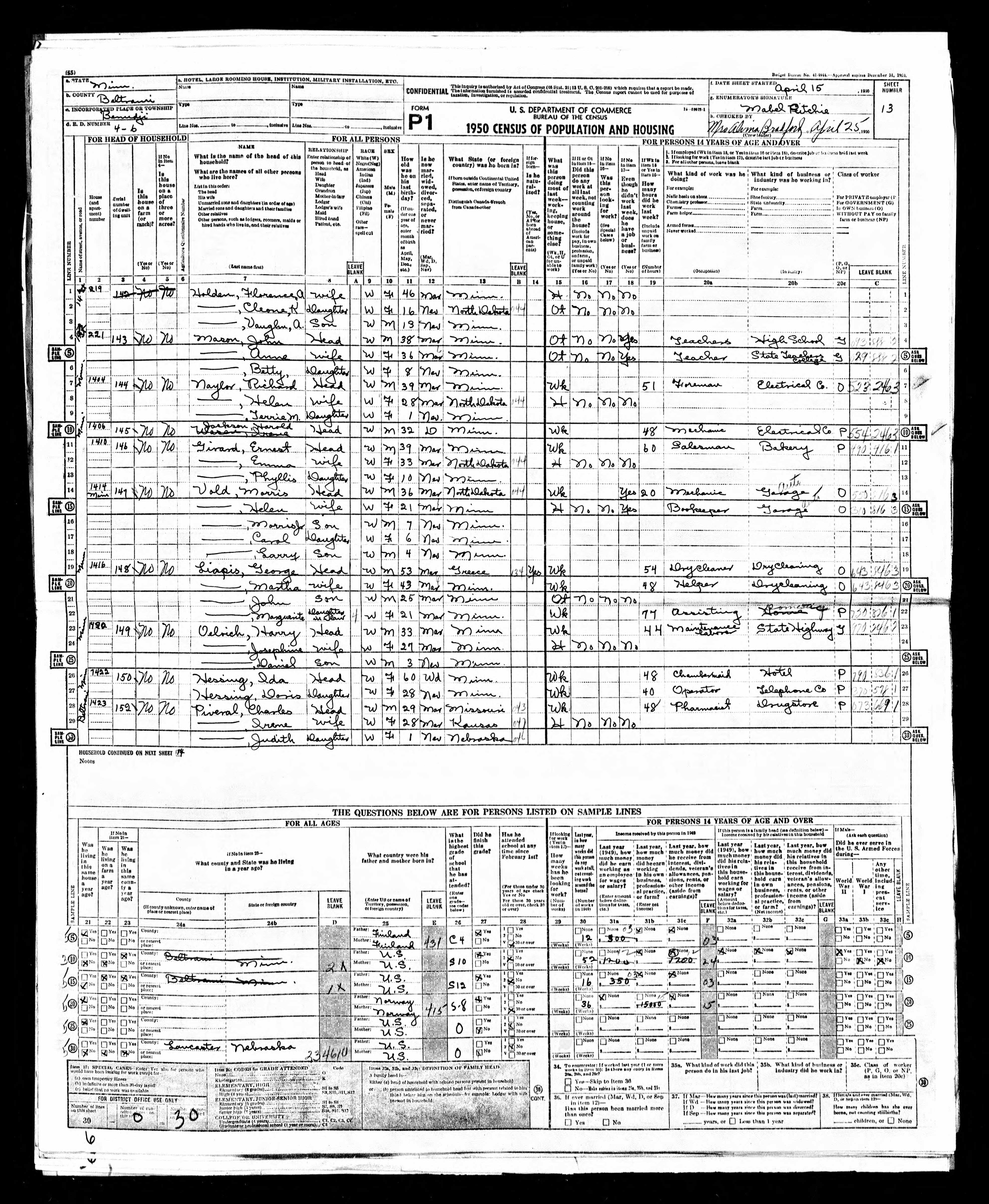 - 1950 Census - Bemidji, Beltrami Co, MN (Listed as Harry Oelrich, age 33, head of household)