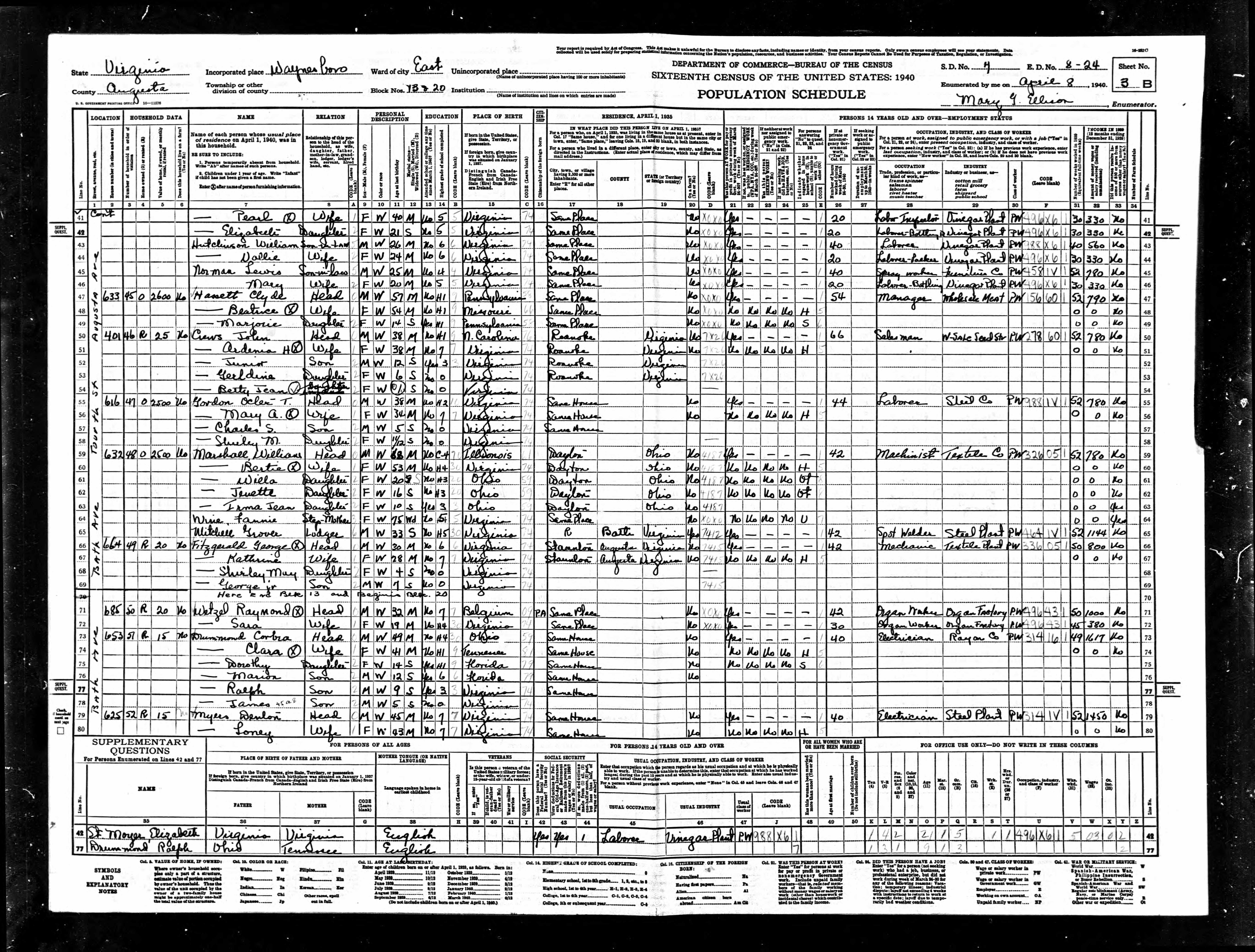 - 1940 Census - Wanesboro, Augusta Co, VI (Listed as Beatrice, age 54, wife of Clyde Hassett)