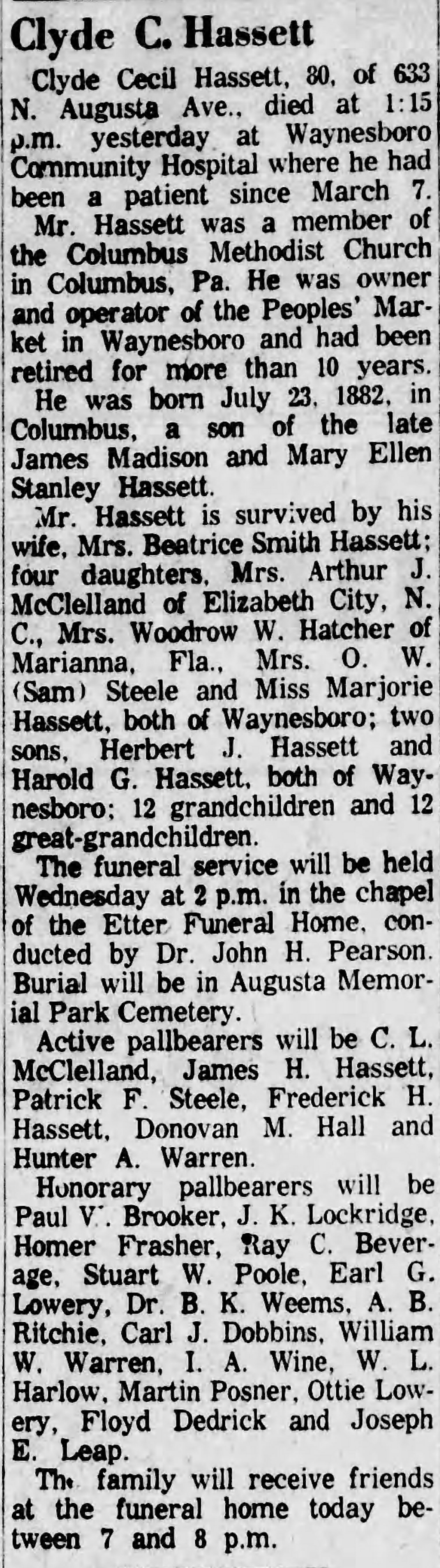 - 1930 Census - South River, Augusta Co, VA (Listed as Beatrice E., age 43, wife of Clyde C. Hassett)