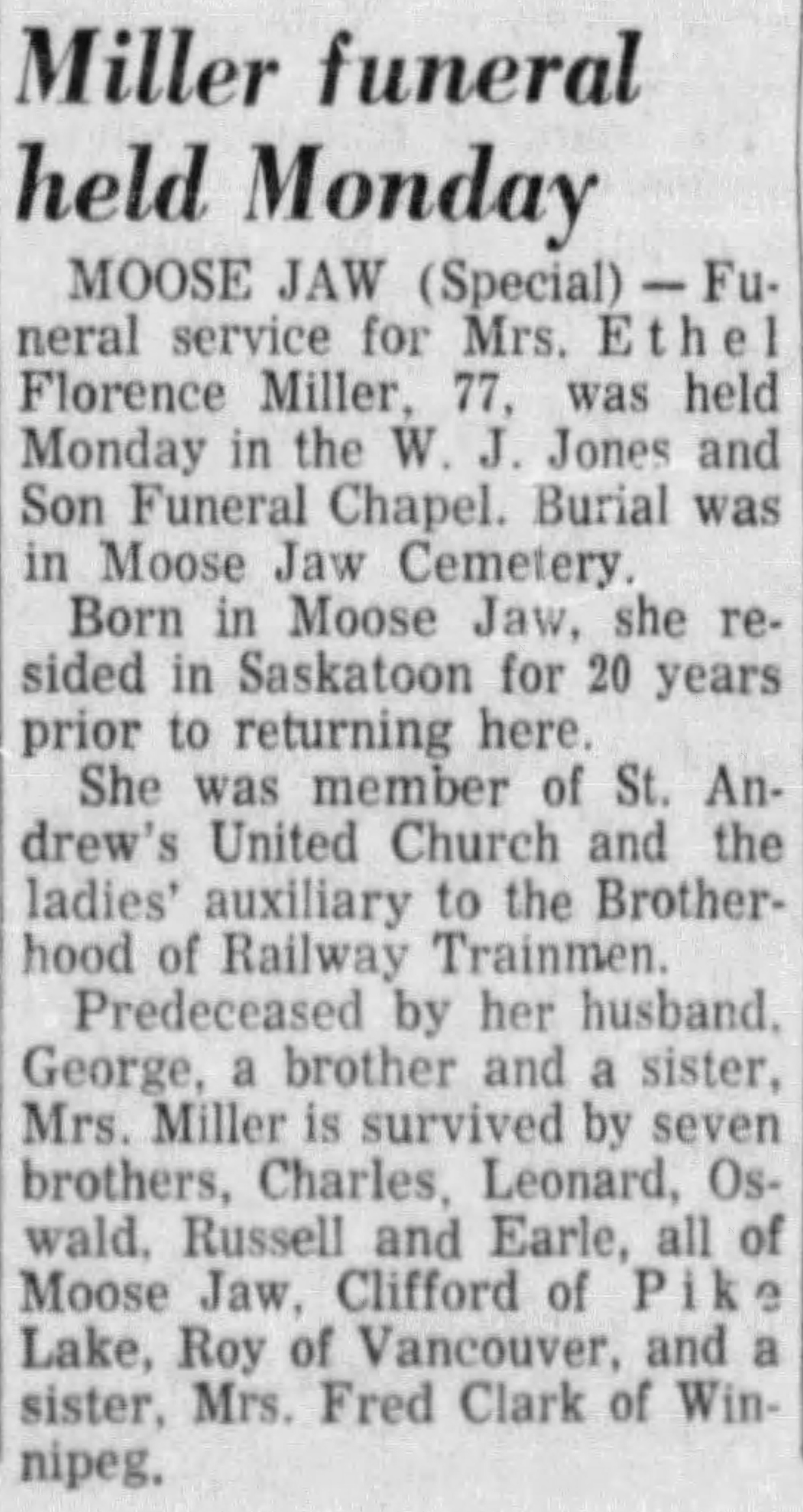 | Buried: | Moose Jaw City Cemetery, Moose Jaw, Saskatchewan, Canada. |