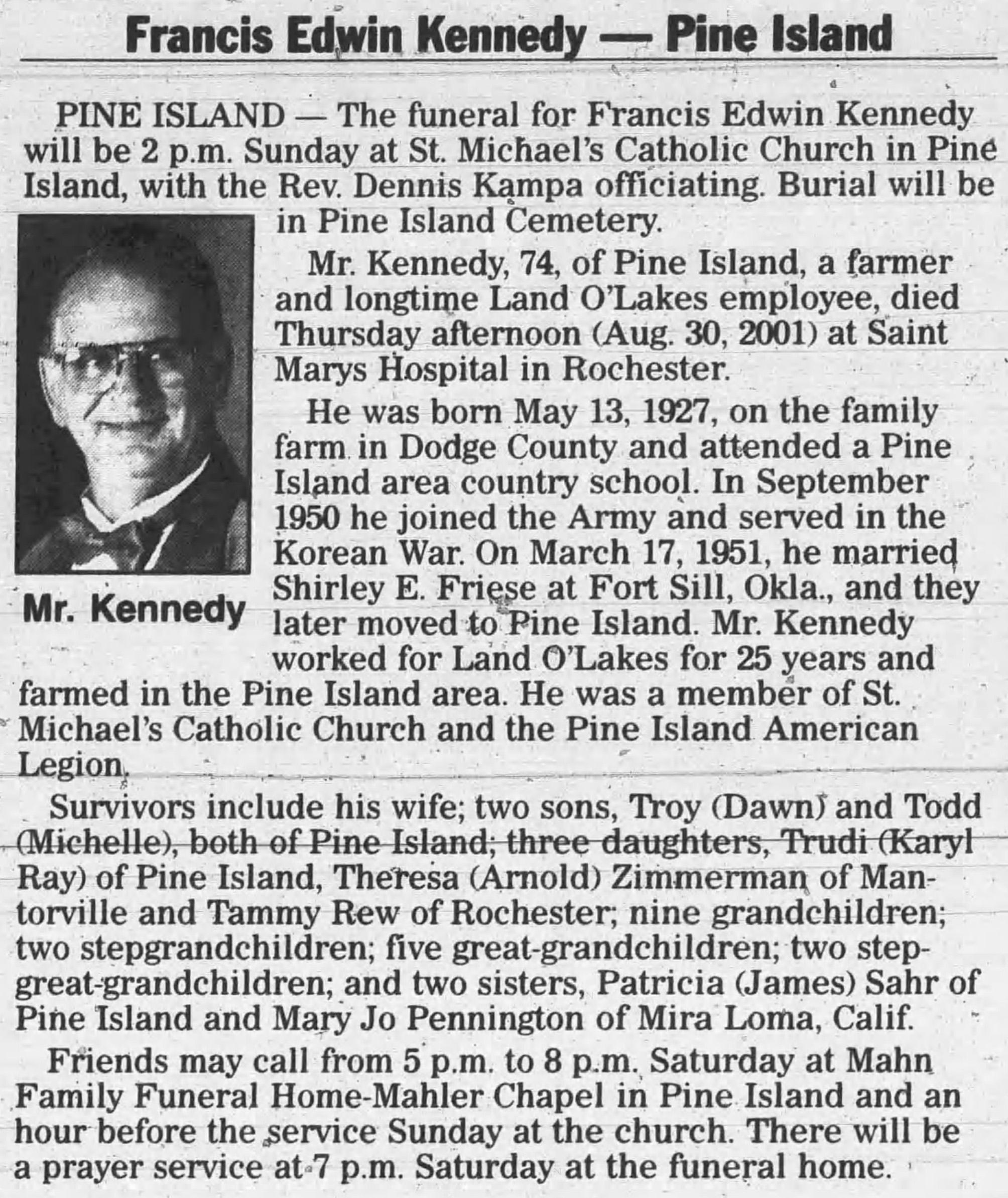 - 1940 Census - Milton Township, Dodge Co, MN (Listed as Francis, age 12, son of Edwin Kennedy)