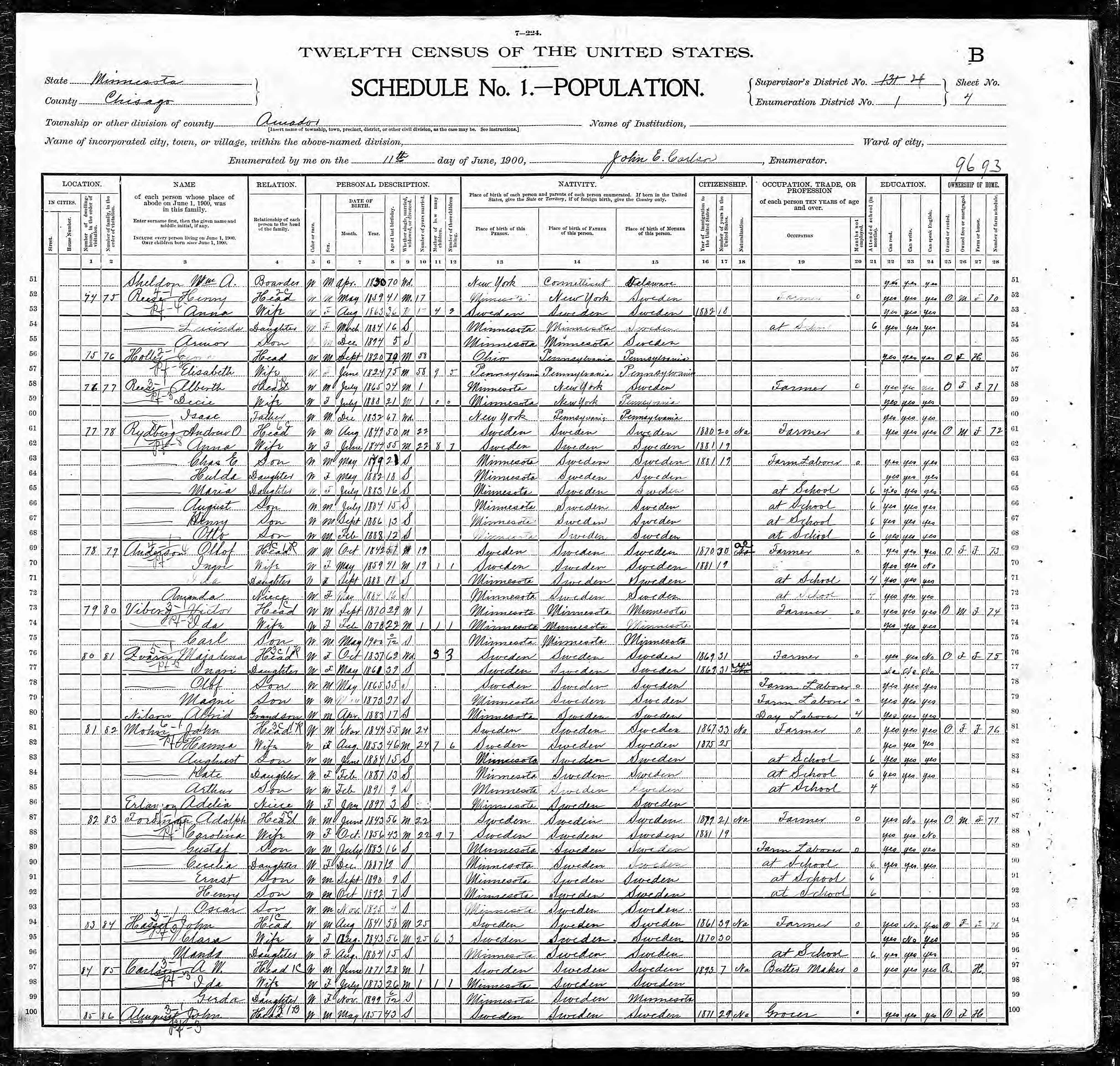 - 1900 Census - Amador Township, Chisago Co, MN (Listed as Decie, age 21, wife of Alberth Reese)